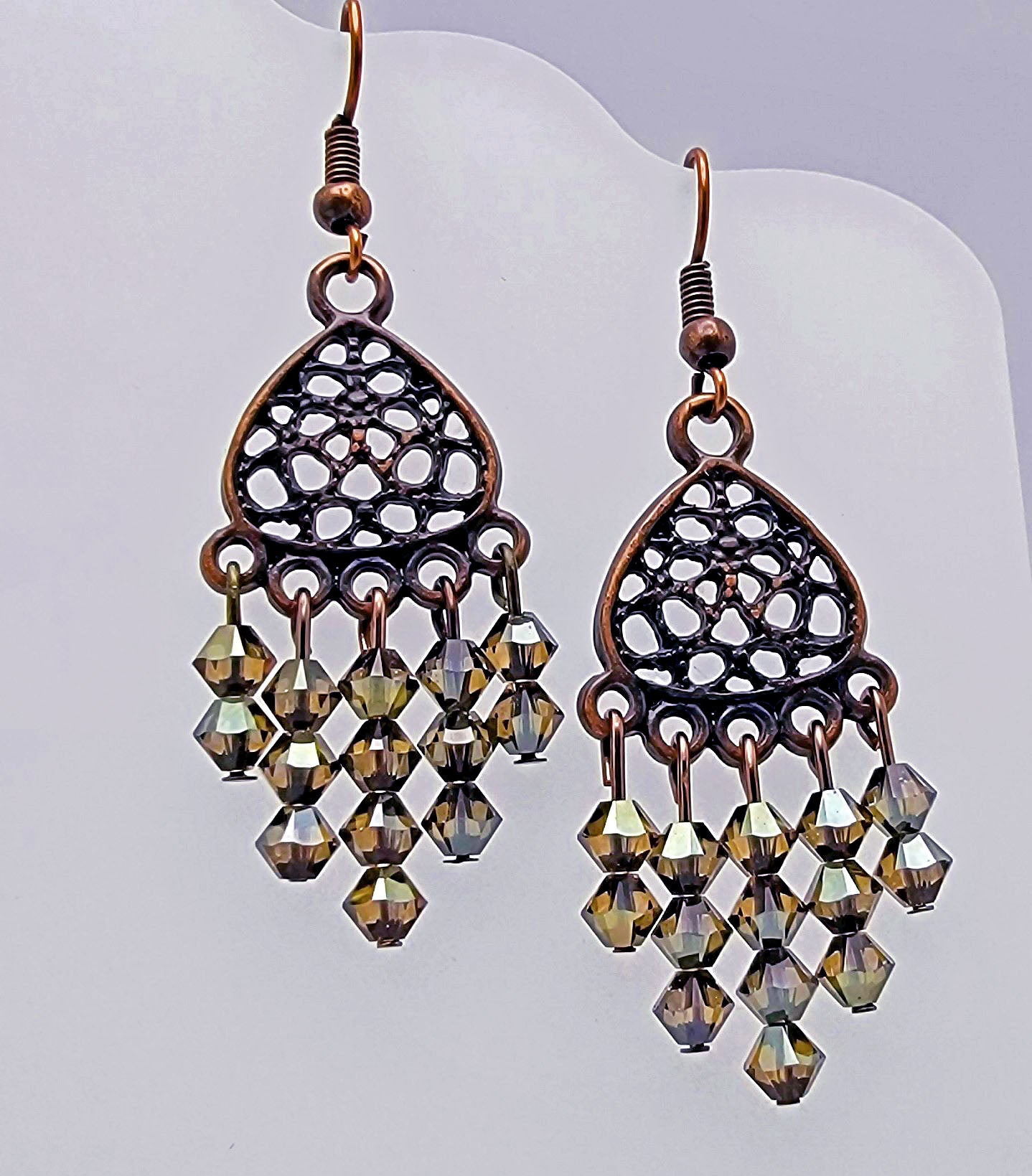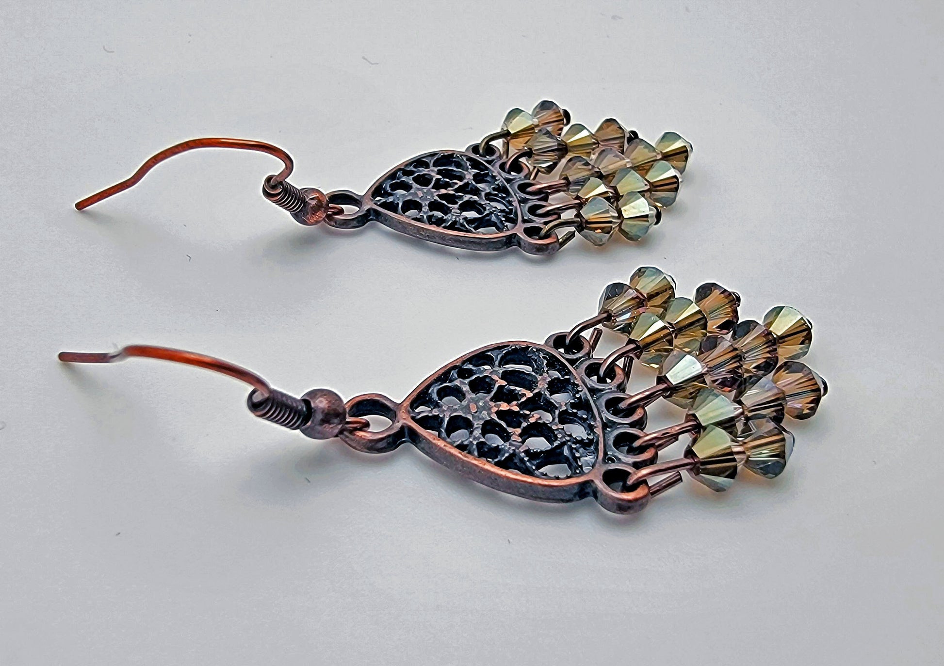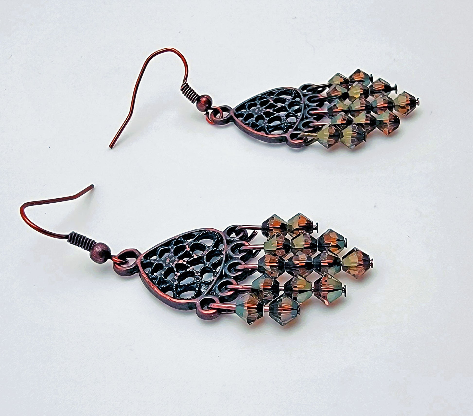 Introducing our stunning Bronze & Copper Chandelier earrings - the perfect combination of elegance and sparkle! Crafted with a delicate swirl design and featuring bronze crystal bicone dangles, these earrings are sure to catch the eye. The faceted crystals beautifully reflect light for a shimmering effect. With a drop length of 1.5" and a total length of 2", these earrings are a must-have accessory. And with a copper plated fishhook ear wire, they're not only gorgeous, but also high-quality. Upgrade your style with these mesmerizing earrings today!