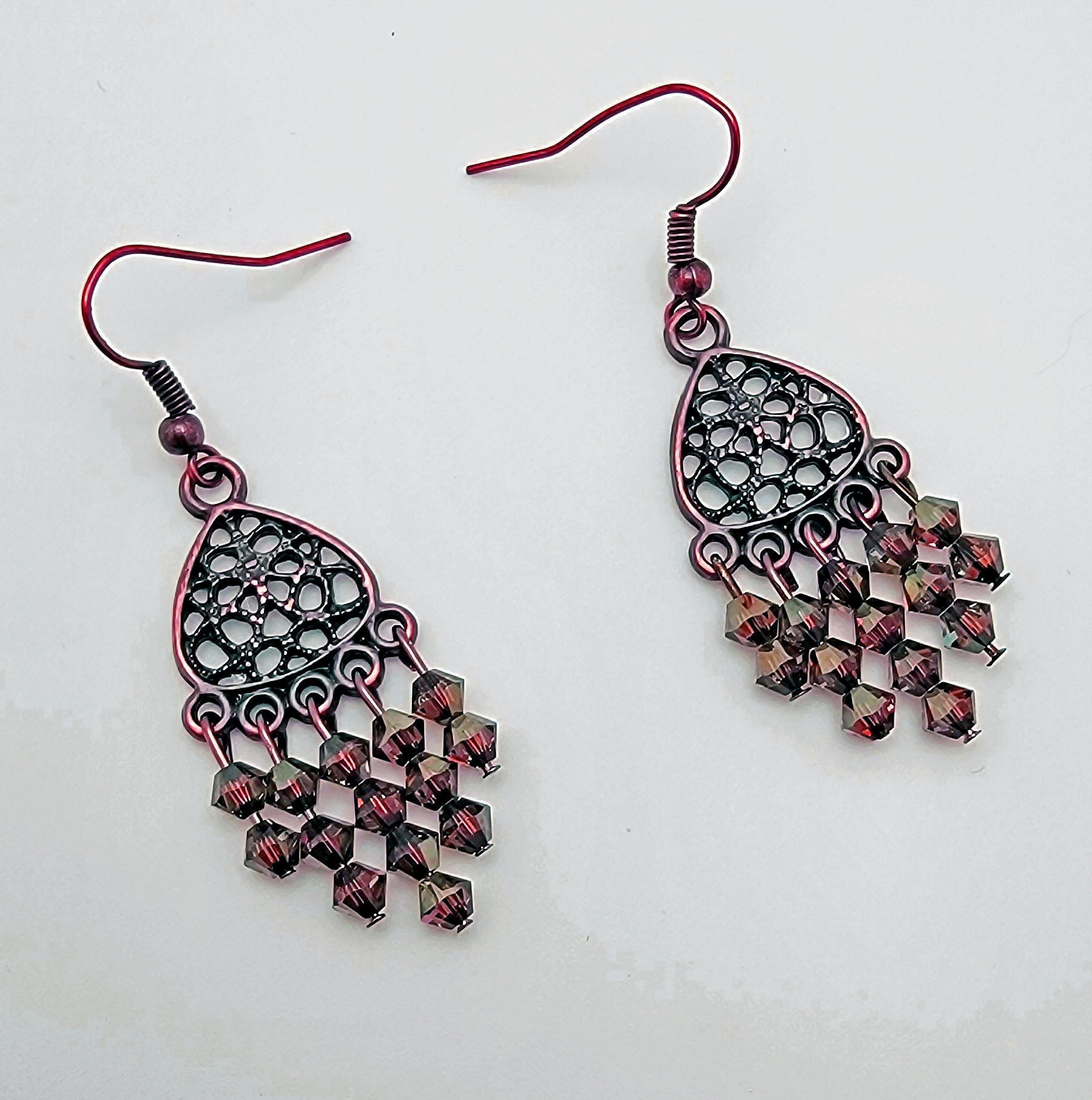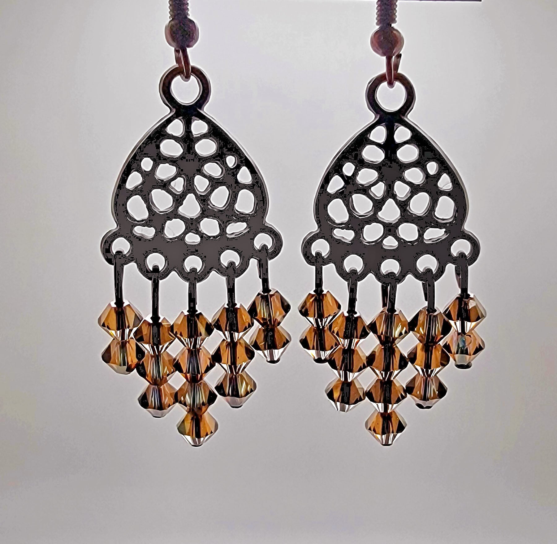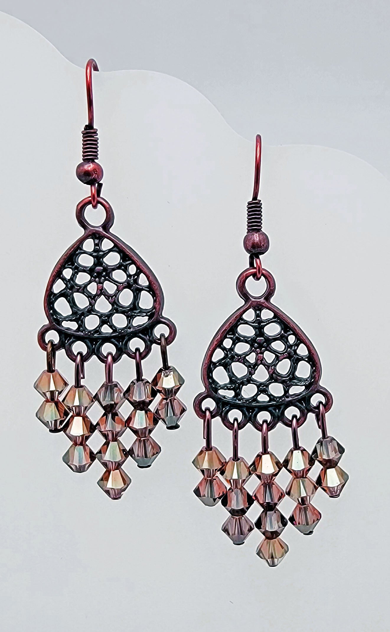 Introducing our stunning Bronze & Copper Chandelier earrings - the perfect combination of elegance and sparkle! Crafted with a delicate swirl design and featuring bronze crystal bicone dangles, these earrings are sure to catch the eye. The faceted crystals beautifully reflect light for a shimmering effect. With a drop length of 1.5" and a total length of 2", these earrings are a must-have accessory. And with a copper plated fishhook ear wire, they're not only gorgeous, but also high-quality. Upgrade your style with these mesmerizing earrings today!