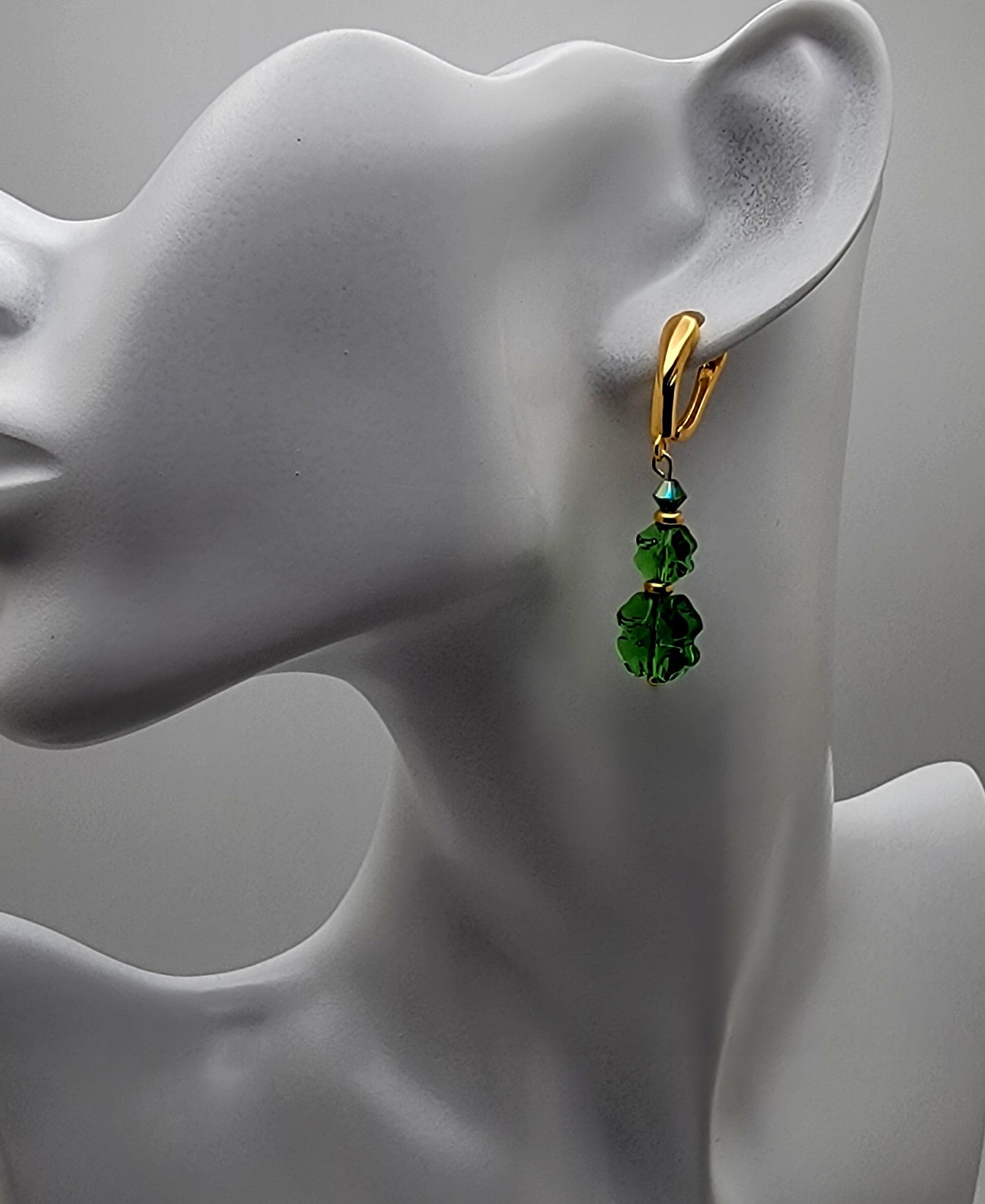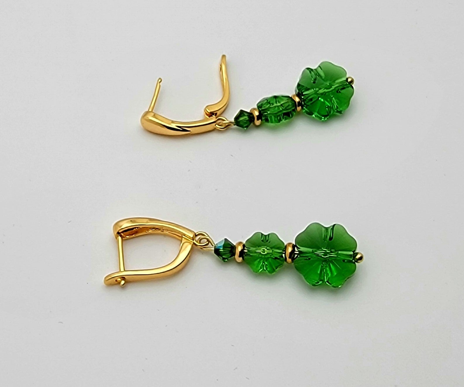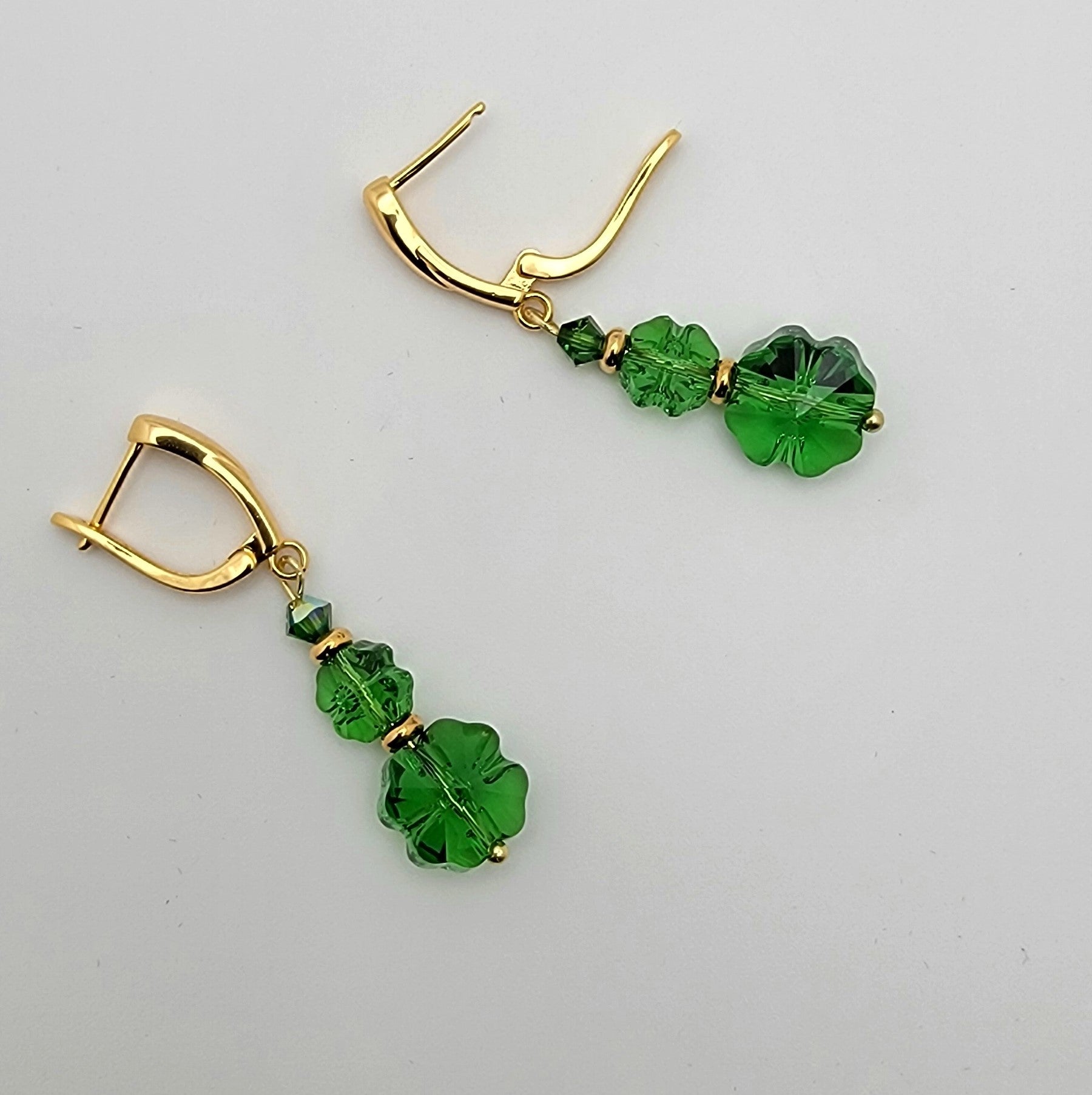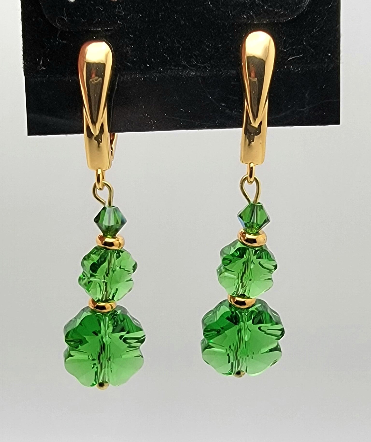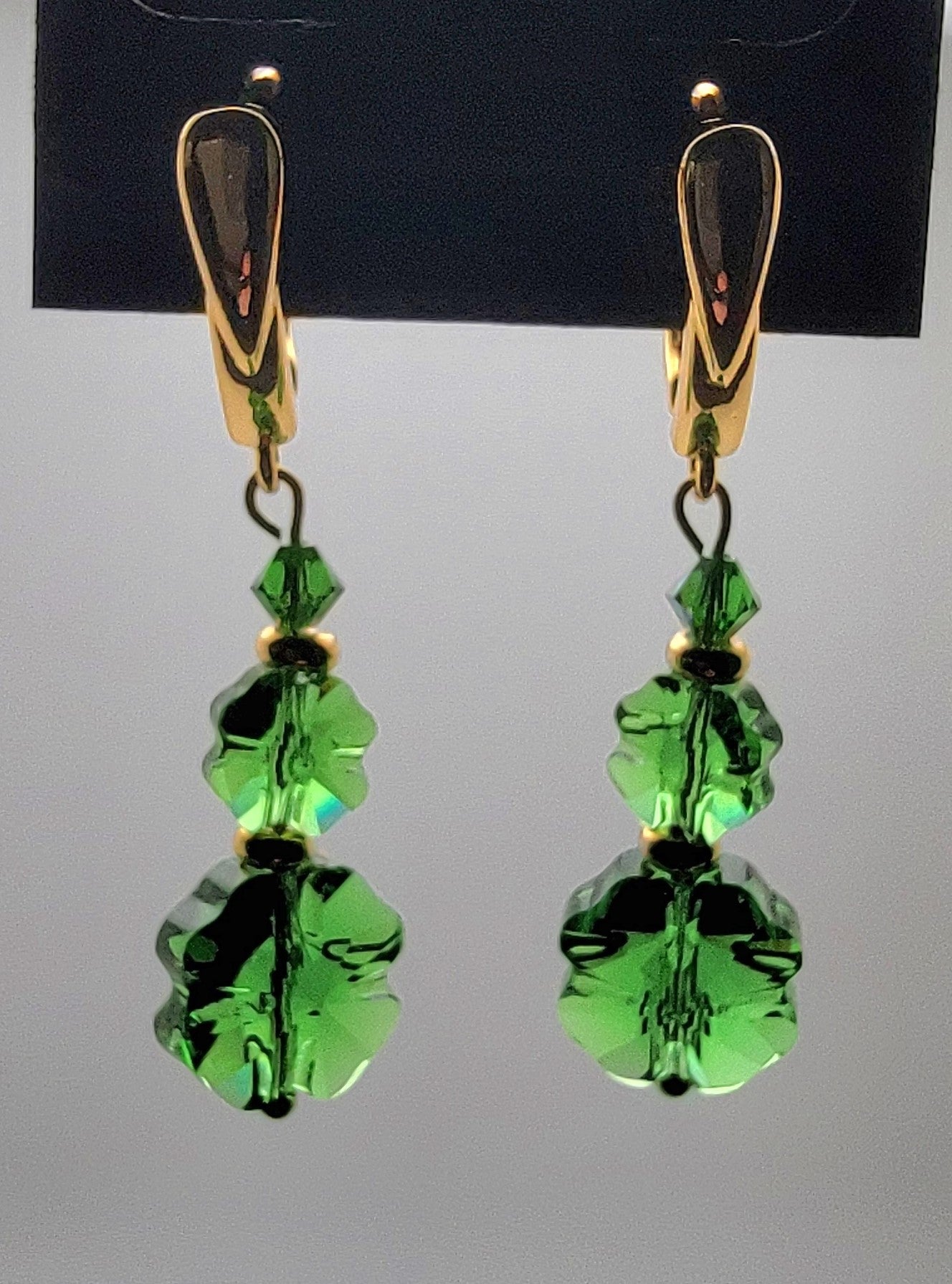 Experience elegance and sophistication with these stunning earrings featuring Crystal Passion fern green clovers. Adorned with delicate gold heishi rounds and gold plated lever back ear wires, these earrings radiate beauty. With a 1 1/4" drop length and a total length of 2", these earrings are 1/2" wide and simply irresistible.