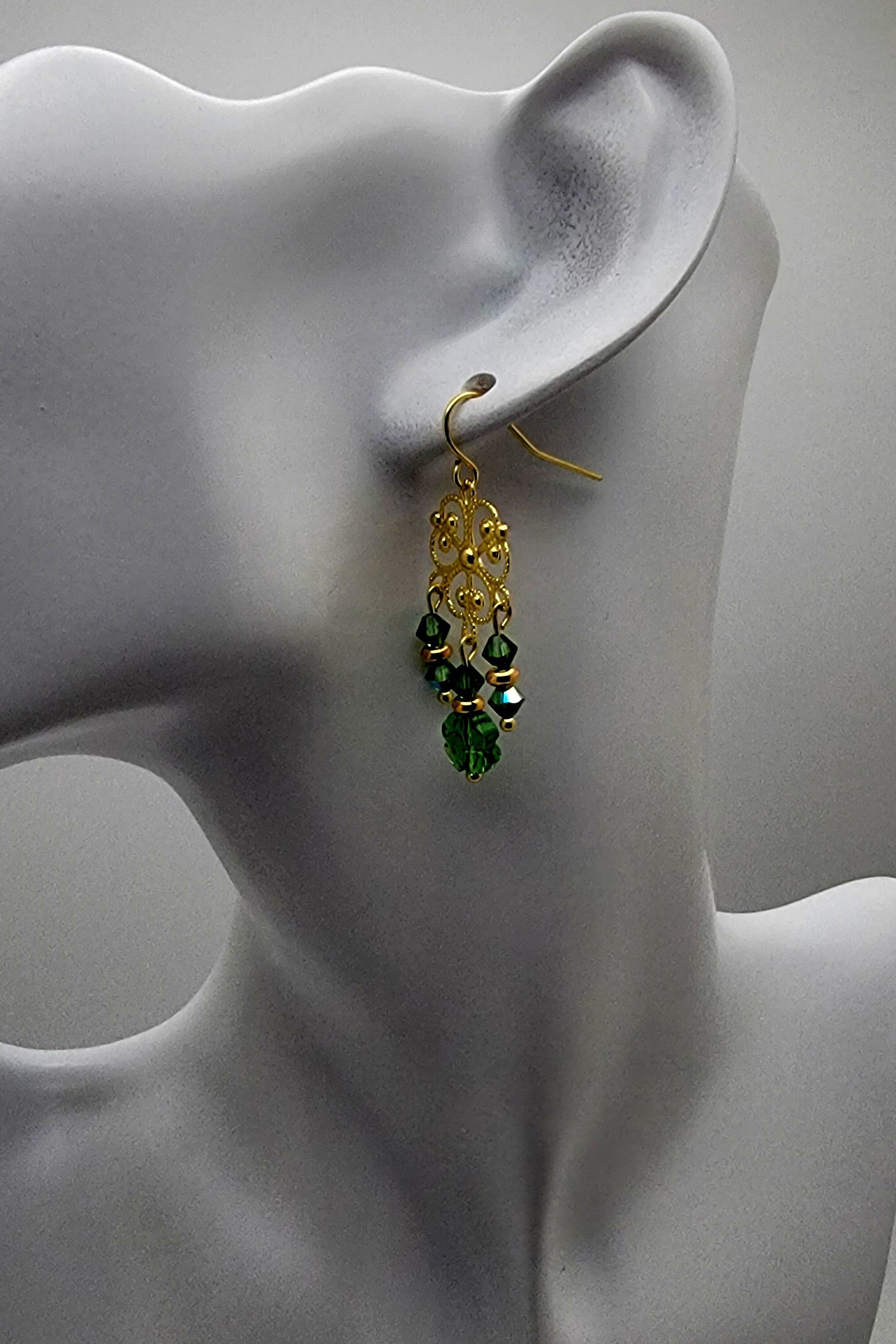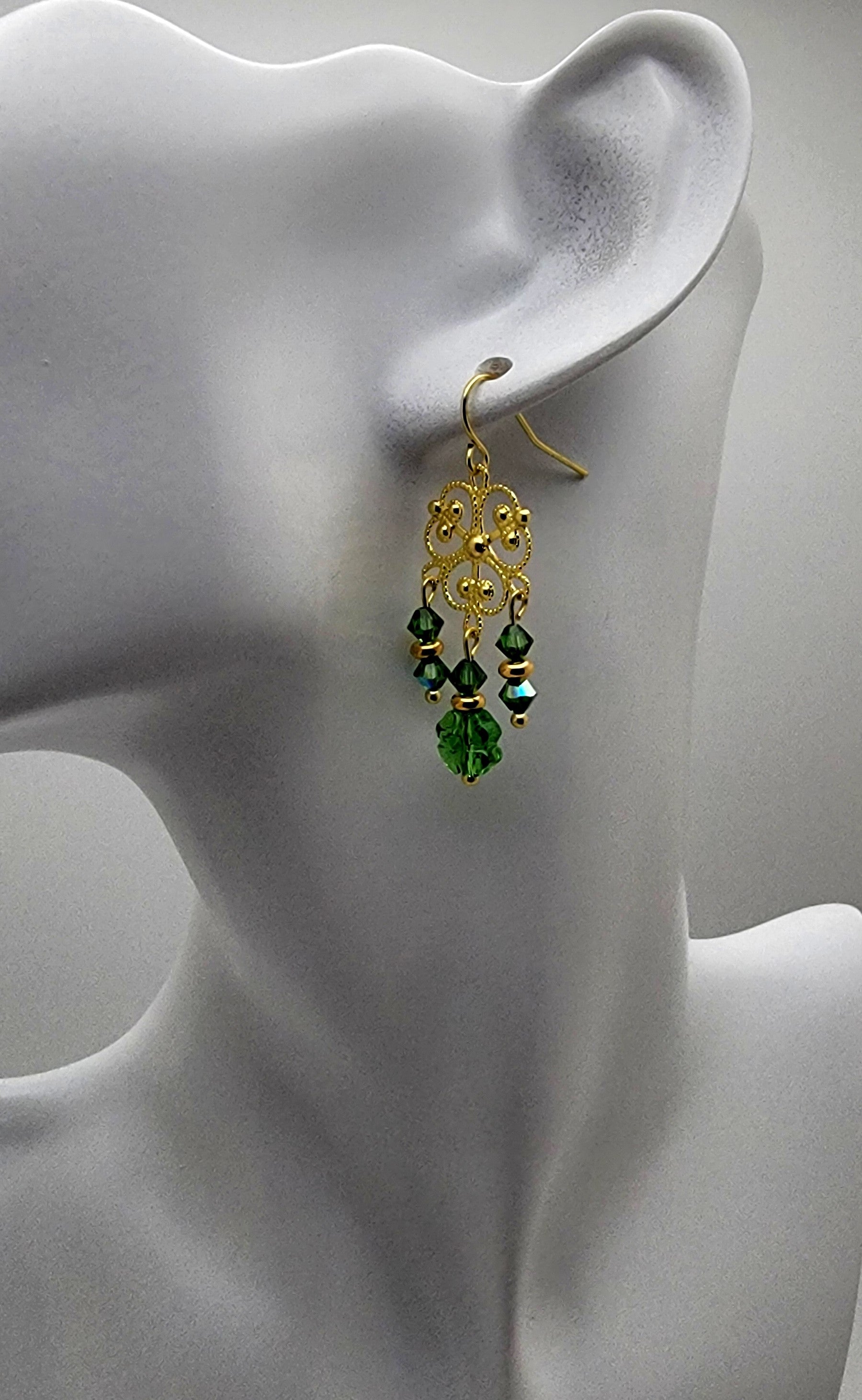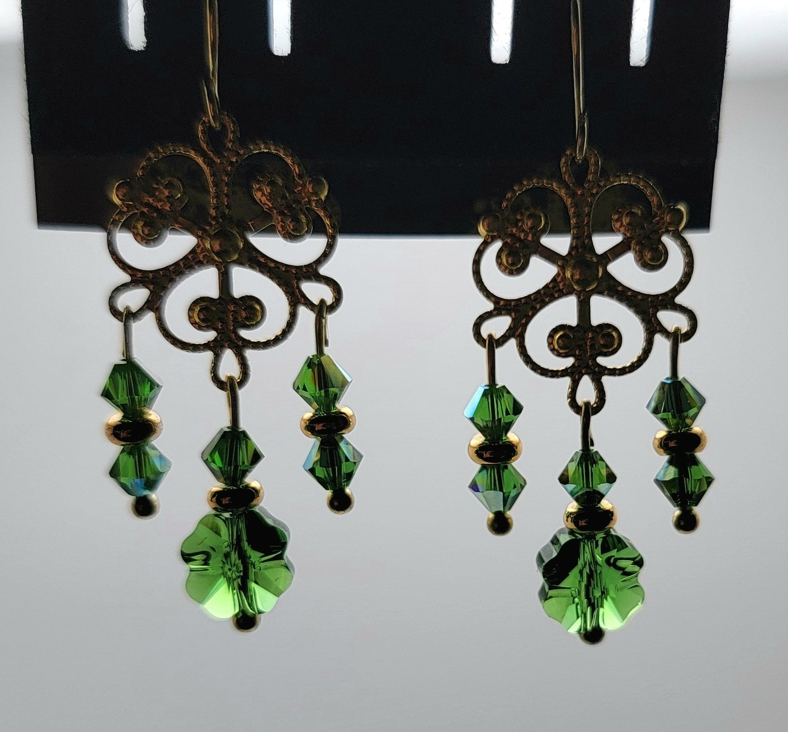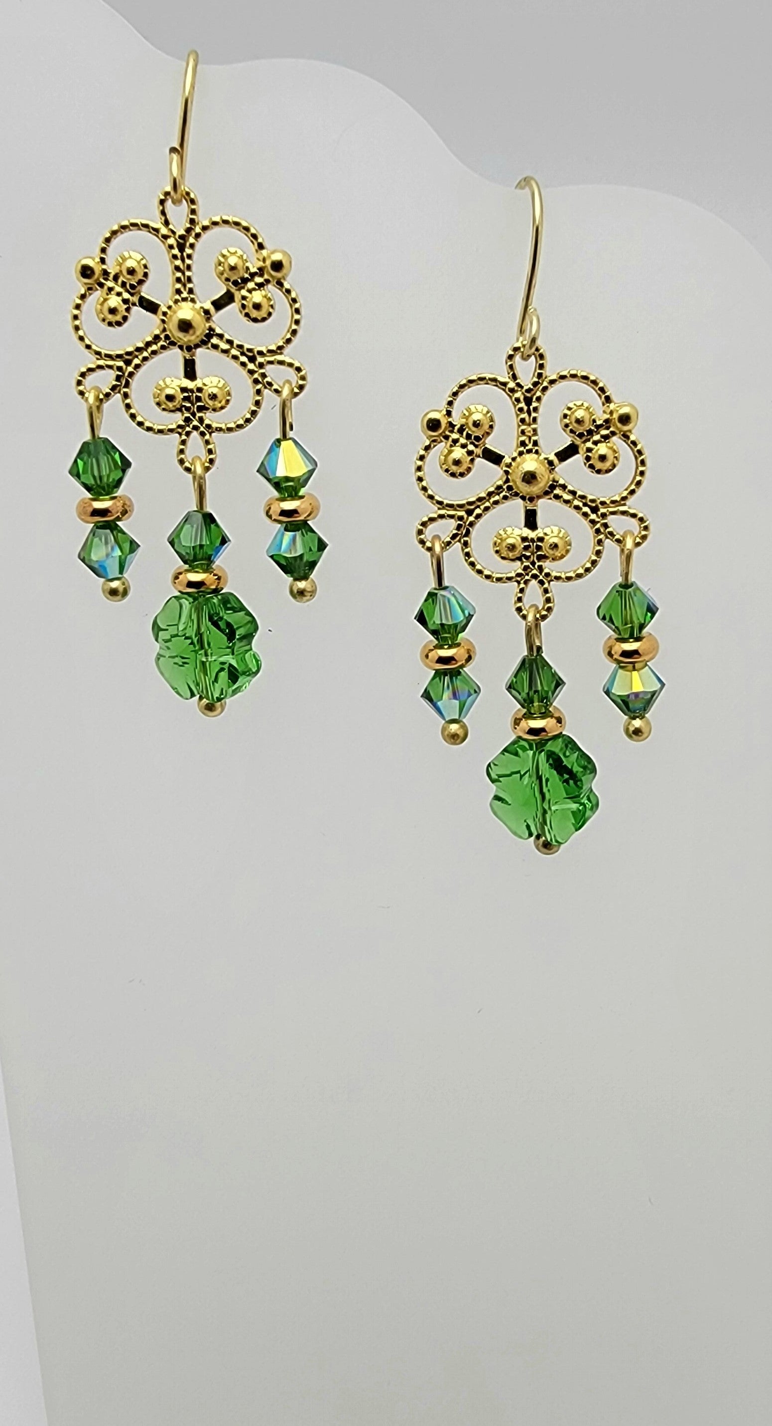 Bring some Irish luck to your wardrobe with our Crystal Passion Fern Green clover earrings. The sparkling green crystal clover and delicate gold charm are accompanied by charming gold heishi rounds and fern green bicones, adding the perfect finishing touch. Wear them with a party dress for a fancy occasion or dress up your favorite jeans at the pub. These versatile earrings have a 1 1/2" drop and total length of 2", with a width of 1/2". The gold plated fishhook ear wire adds a touch of elegance.