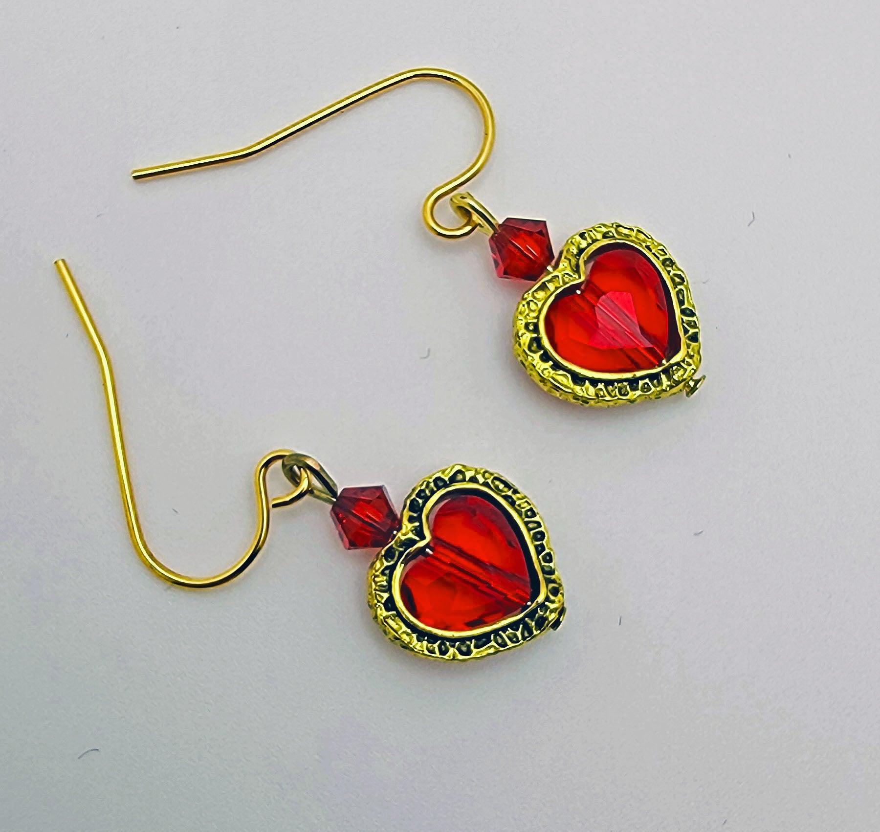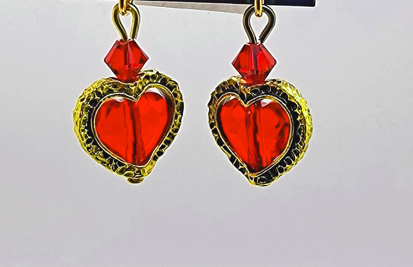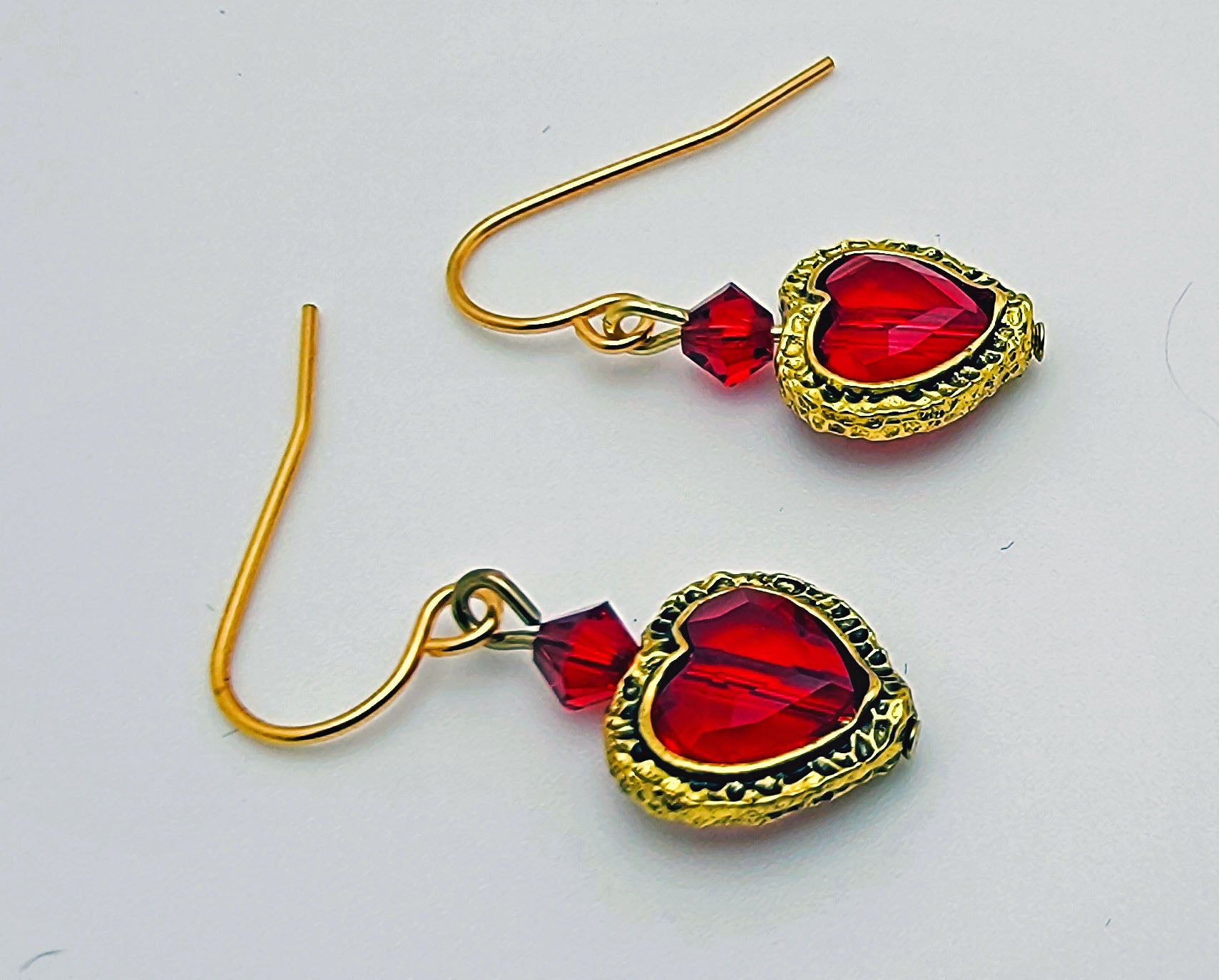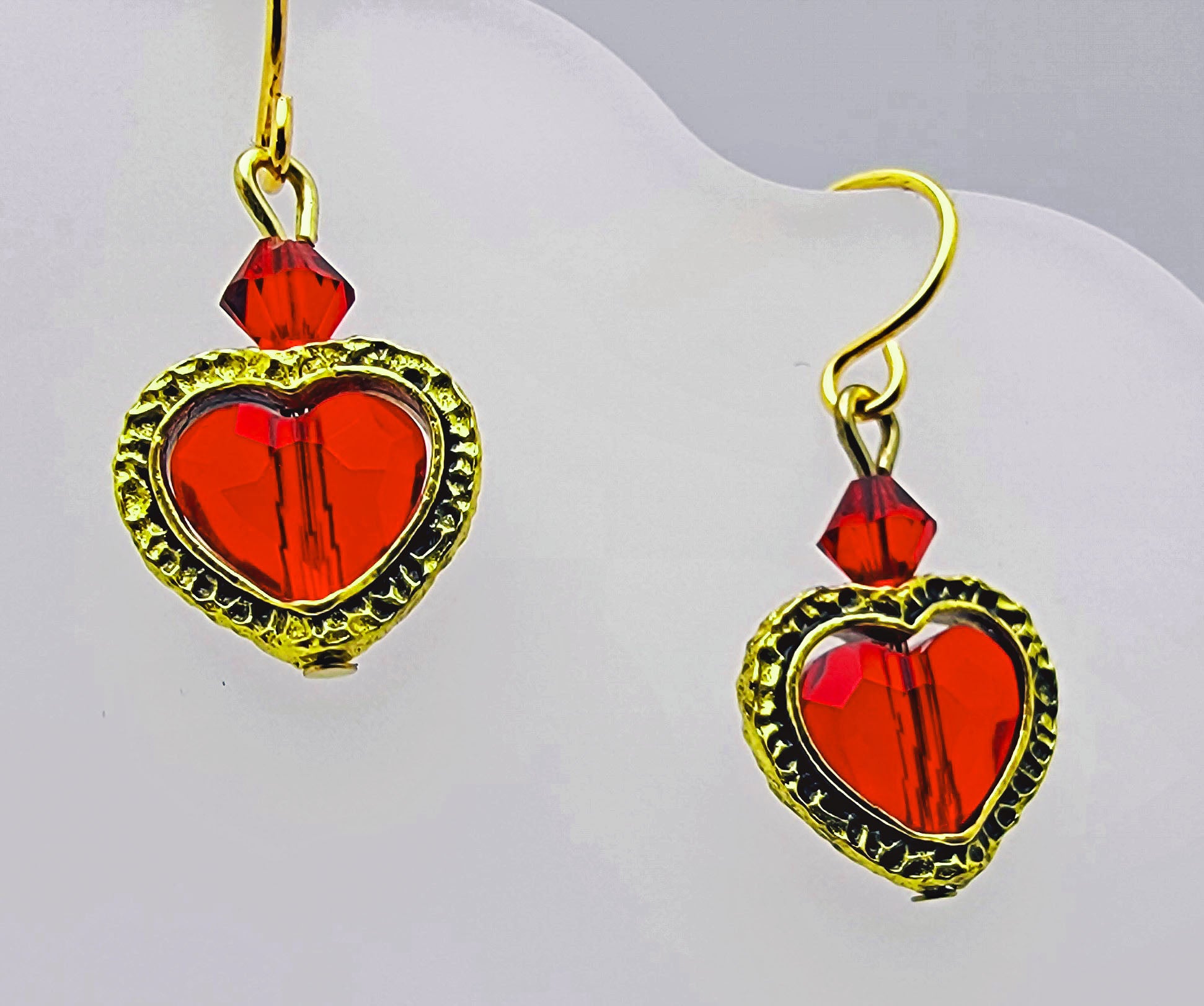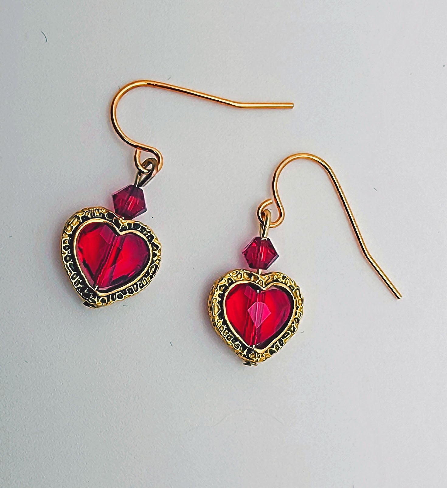 Experience the captivating beauty of Siam crystal and gold hearts with our Crystal Passion earrings. The translucent, faceted crystal heart sparkles and shines through the hammered gold frame, making a stunning statement of love. The classic design of these earrings, with a drop of 3/4" and a total length of 1", is both timeless and elegant. Complete your look with the gold plated fishhook ear wire.