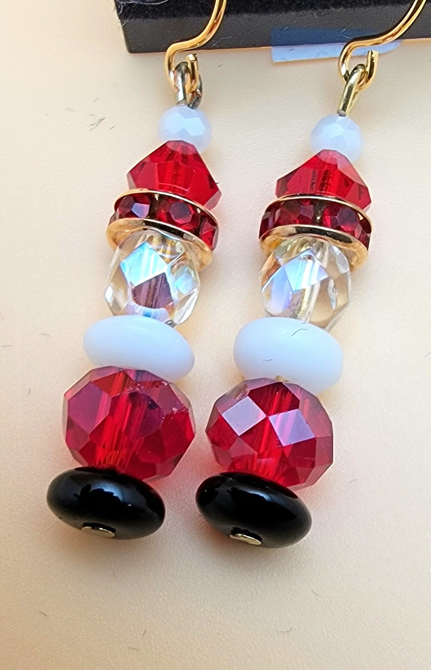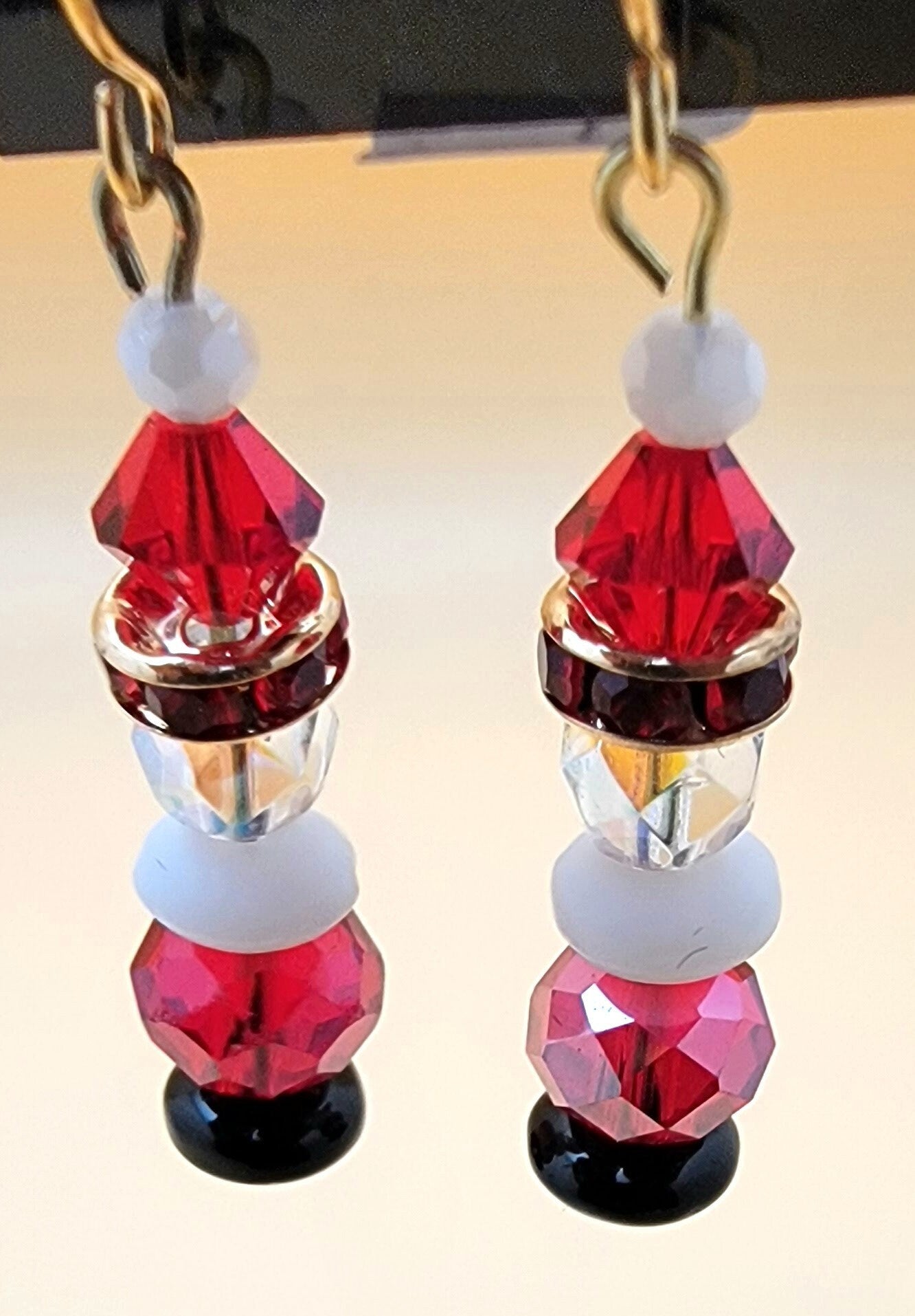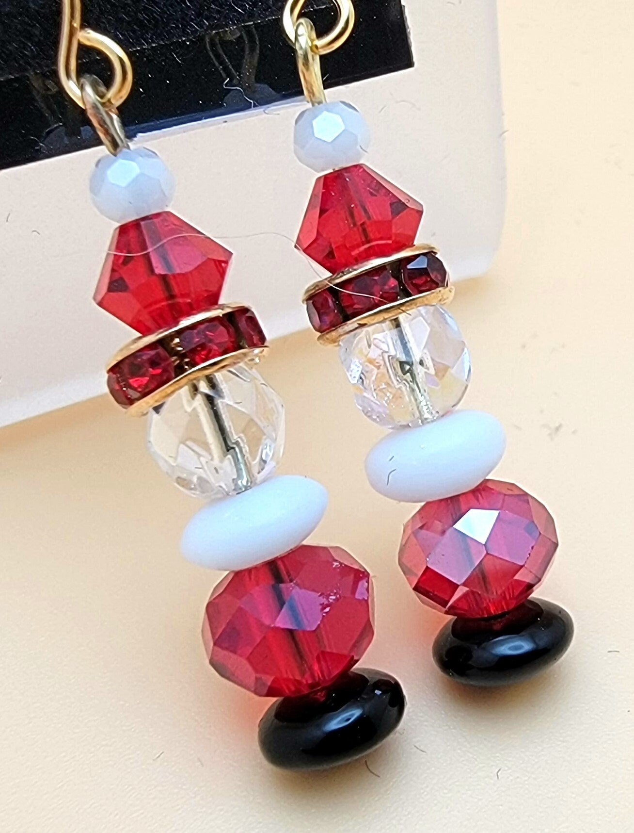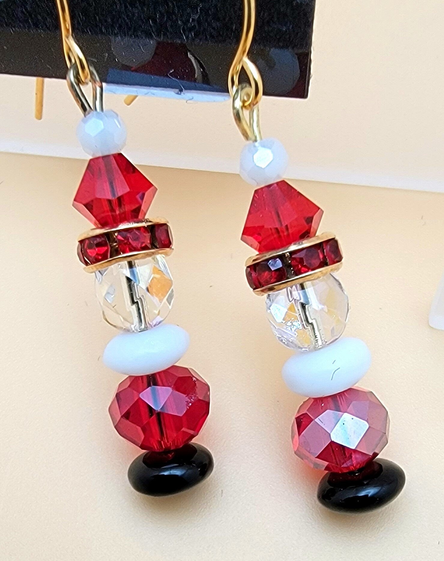 Celebrate the Christmas holiday with a touch of sparkle and magic from Santa! These Crystal Santa Claus earrings feature red and clear crystal beads that glisten and shine in the light. Measuring approximately 1 1/4" from the gold plated fishhook ear wires, they are the perfect addition to any festive outfit. Get ready to spread some holiday cheer with these jolly earrings!