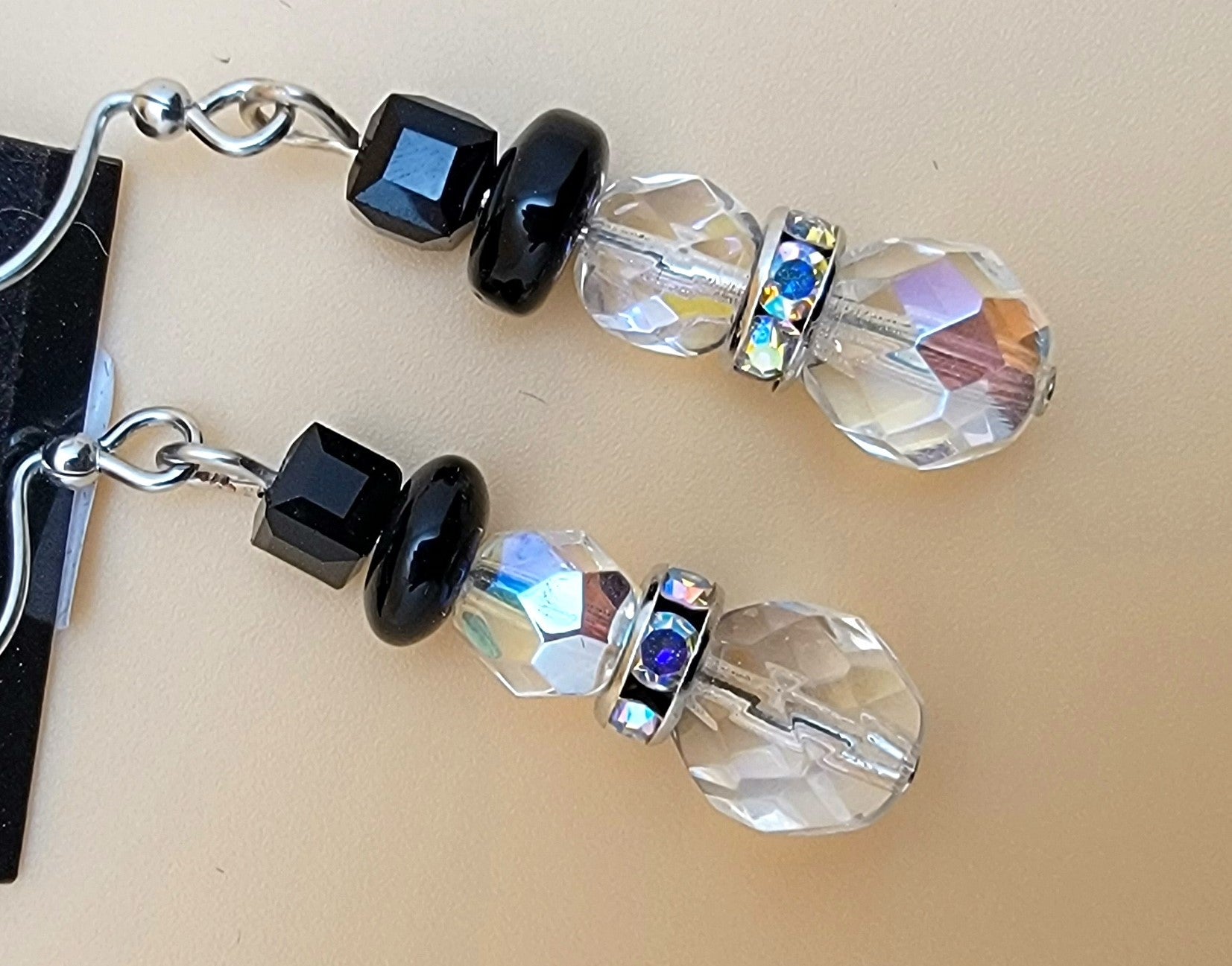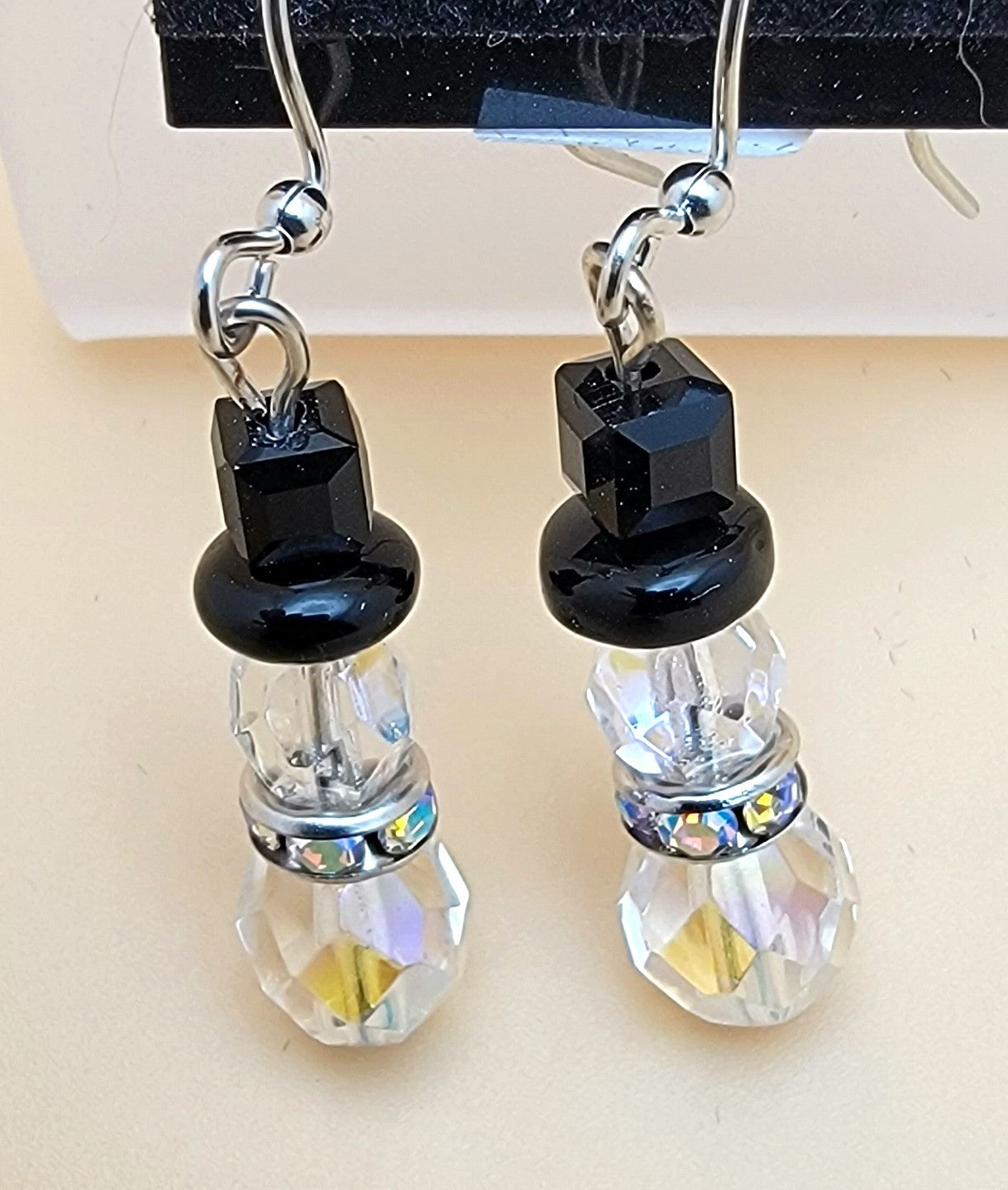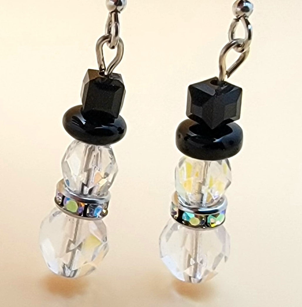 Let it snow! But not just any snow, snowmen that are truly adorable. These crystal snowman earrings are both sparkly and whimsical, with a rondelle scarf embellished with clear rhinestone crystals and silver accents. The earrings dangle approximately 1" from the ear wire, and the fishhook ear wires will coordinate with the accent color, featuring plain fishhook loops. Bring a touch of winter magic to your jewelry collection with these charming snowman earrings!