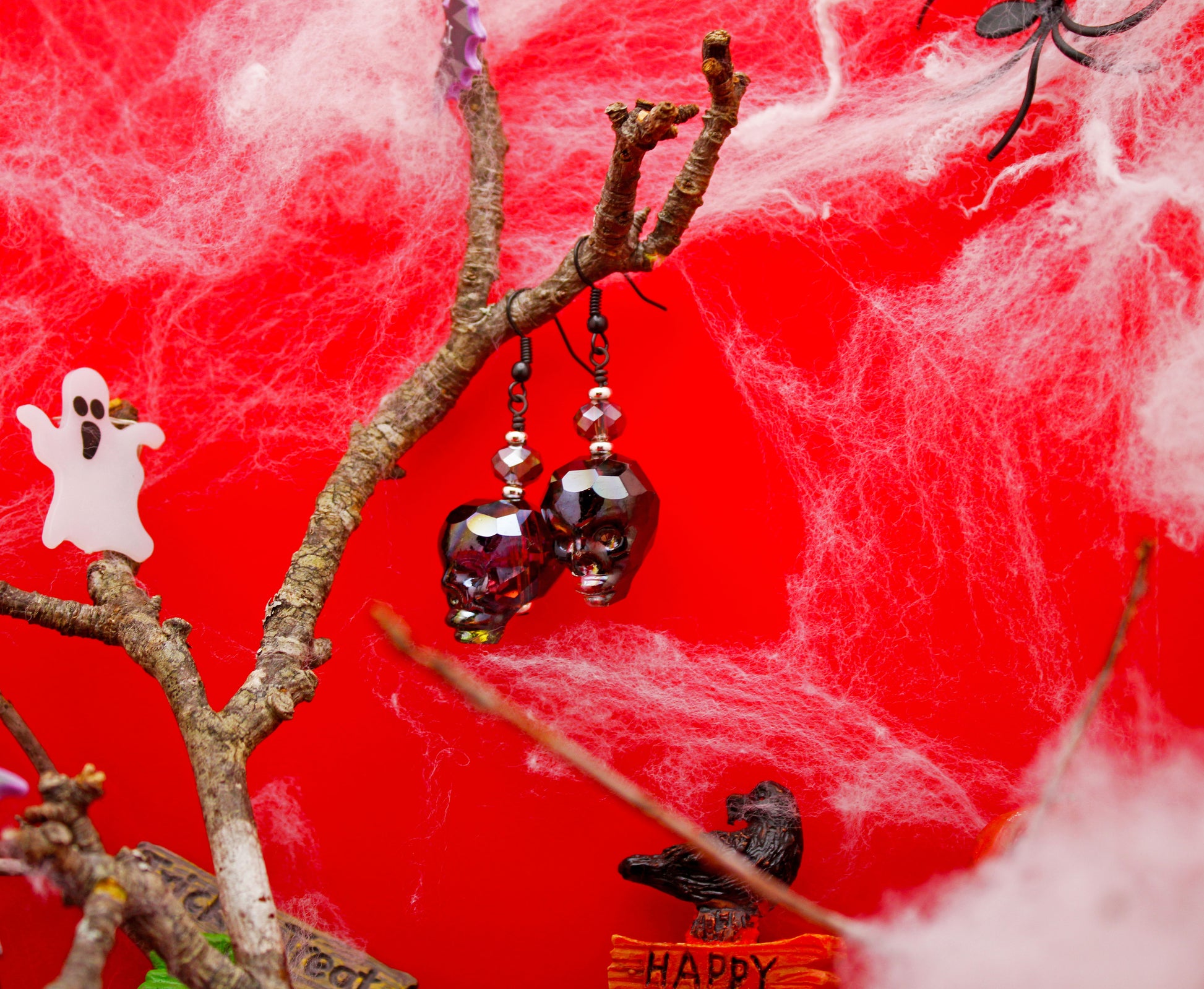 These crystal skulls bring a spooky and mysterious vibe to Halloween. The large skulls are crafted from faceted smoky glass with subtle purple undertones that catch the light. They're paired with silver heishi beads and round faceted smoky glass beads for an elegant touch. You can choose between a small accent bead (E153) or a larger one (E154). Keep in mind, due to the size of the glass skulls, the earrings do have a bit of weight to them.