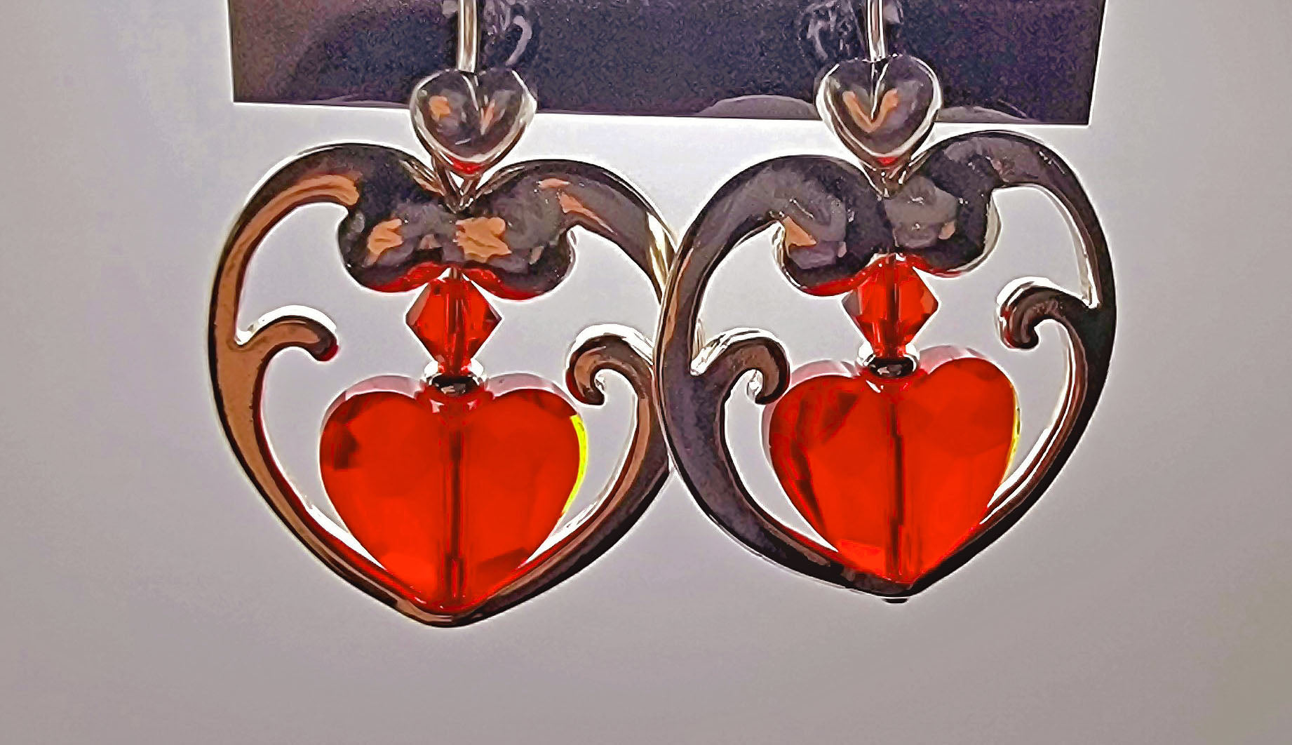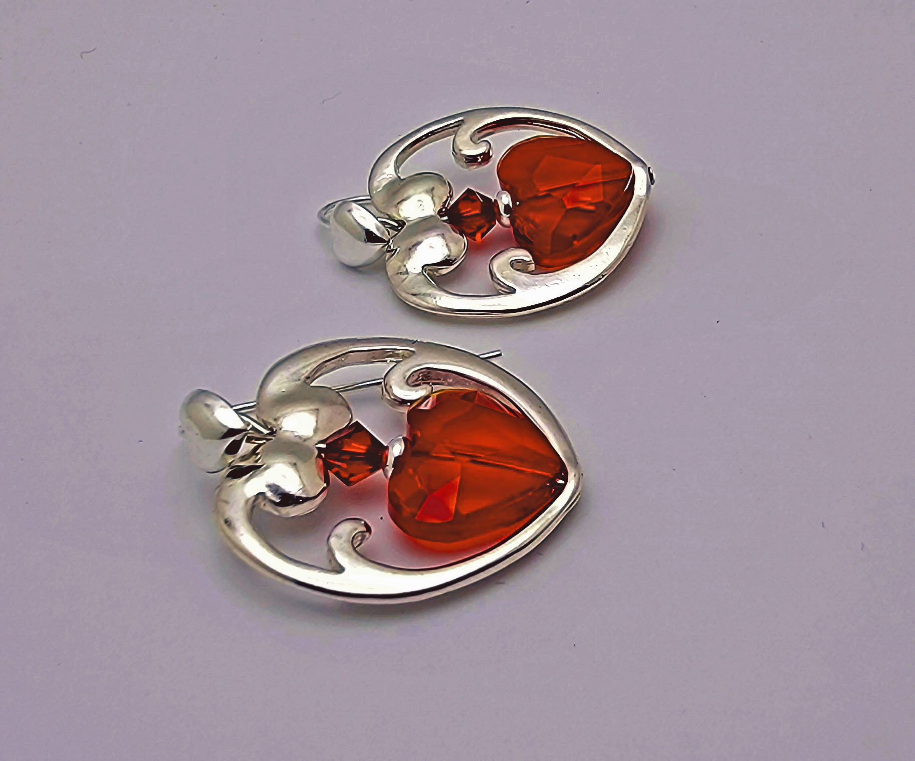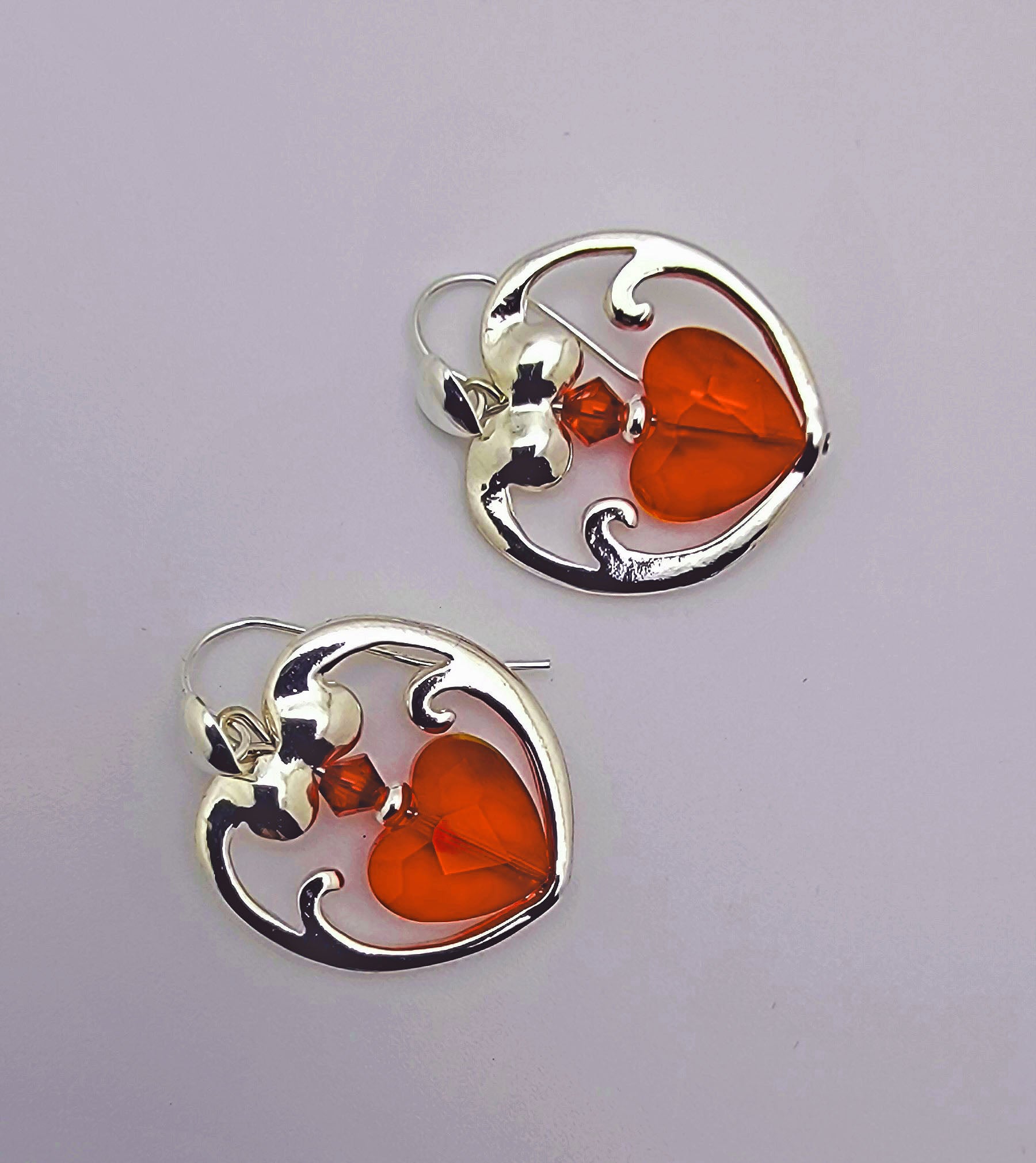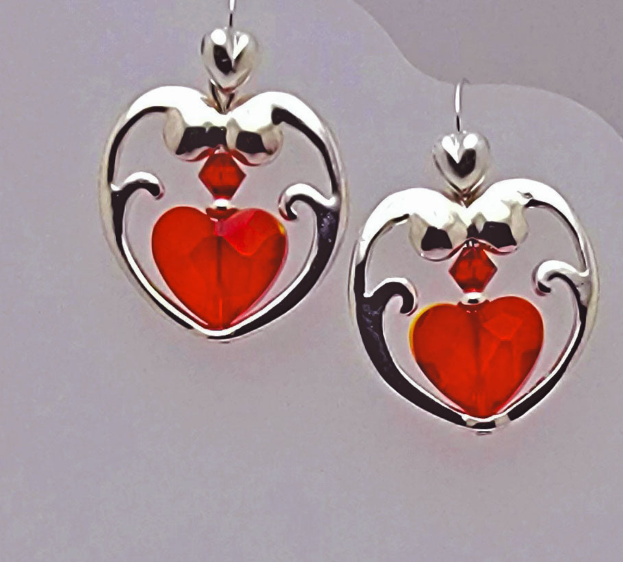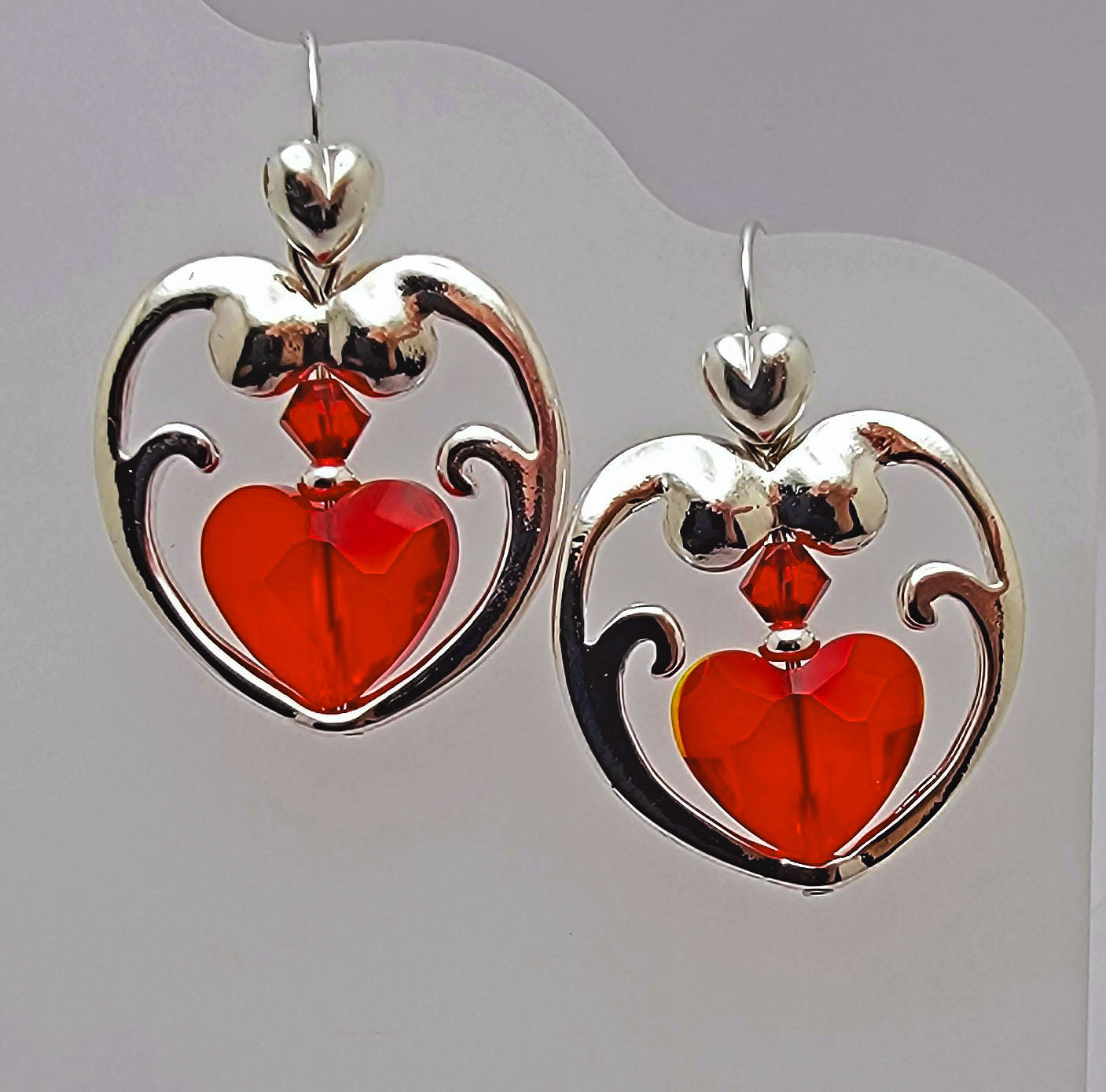 These stunning silver and red open heart earrings are a modern and stylish addition to any outfit. The silver plated heart frame beautifully encircles the red crystal heart and matching Swarovski scarlet bicone. Complete with a silver plated fishhook earwire featuring a charming little heart, this one-of-a-kind earring set is the perfect way to express your love for her. These earrings have a 1.25" drop and weigh approximately .25 oz, making them both lightweight and elegant.