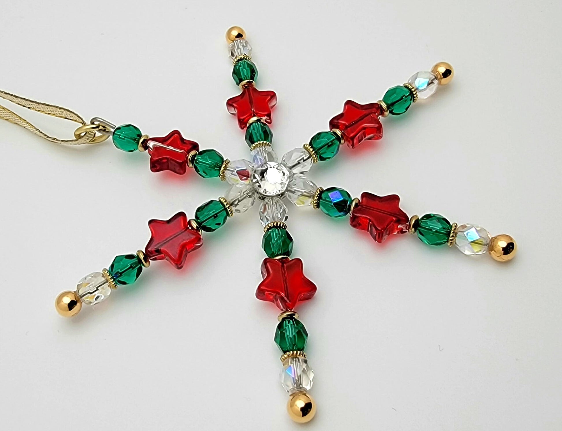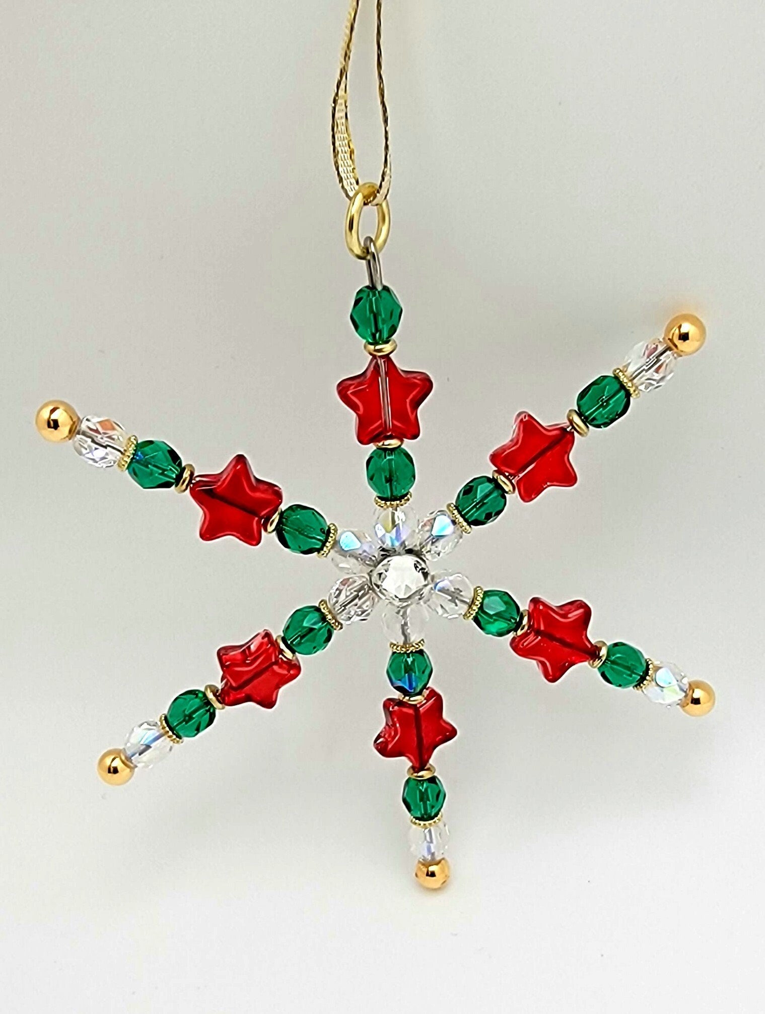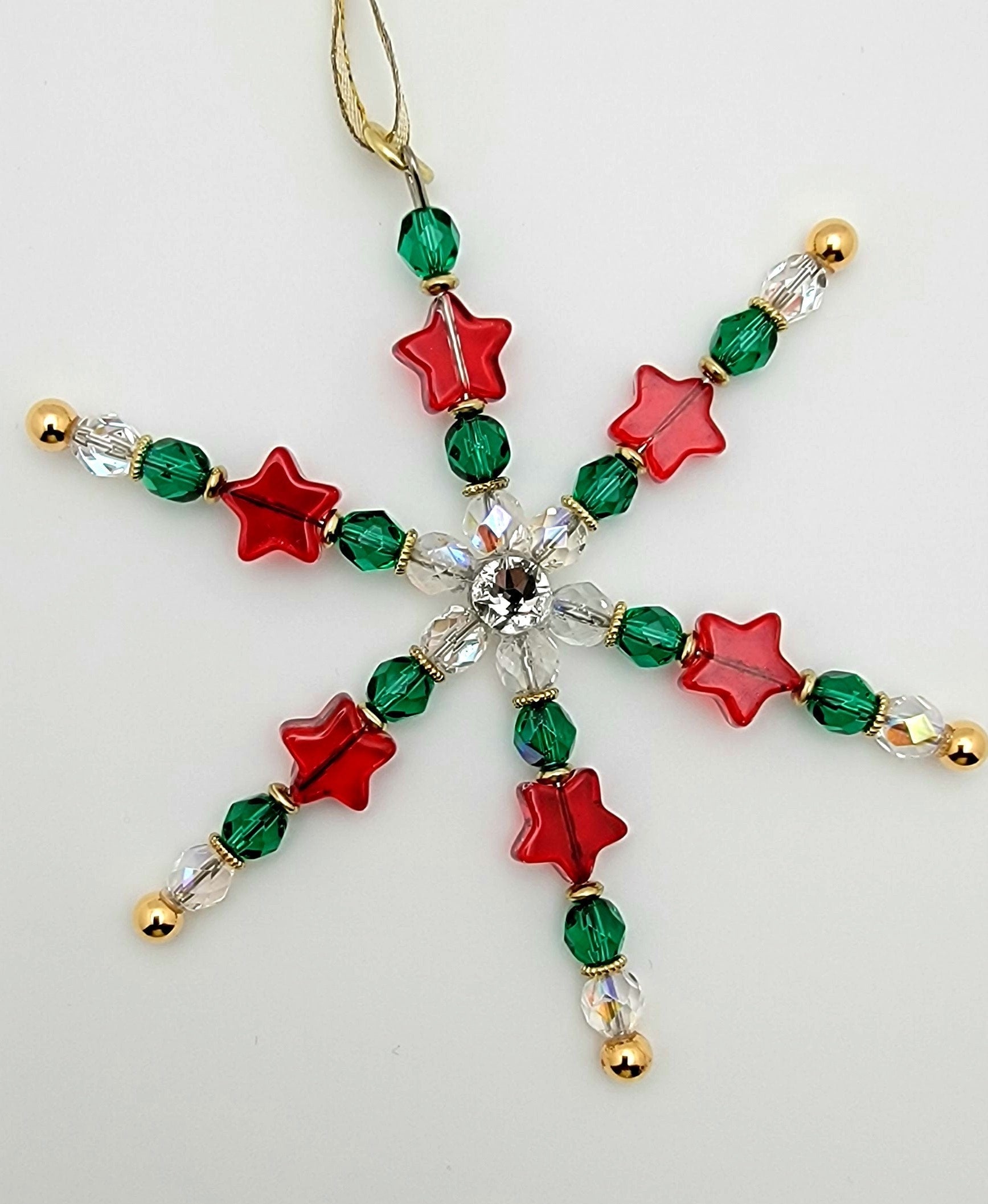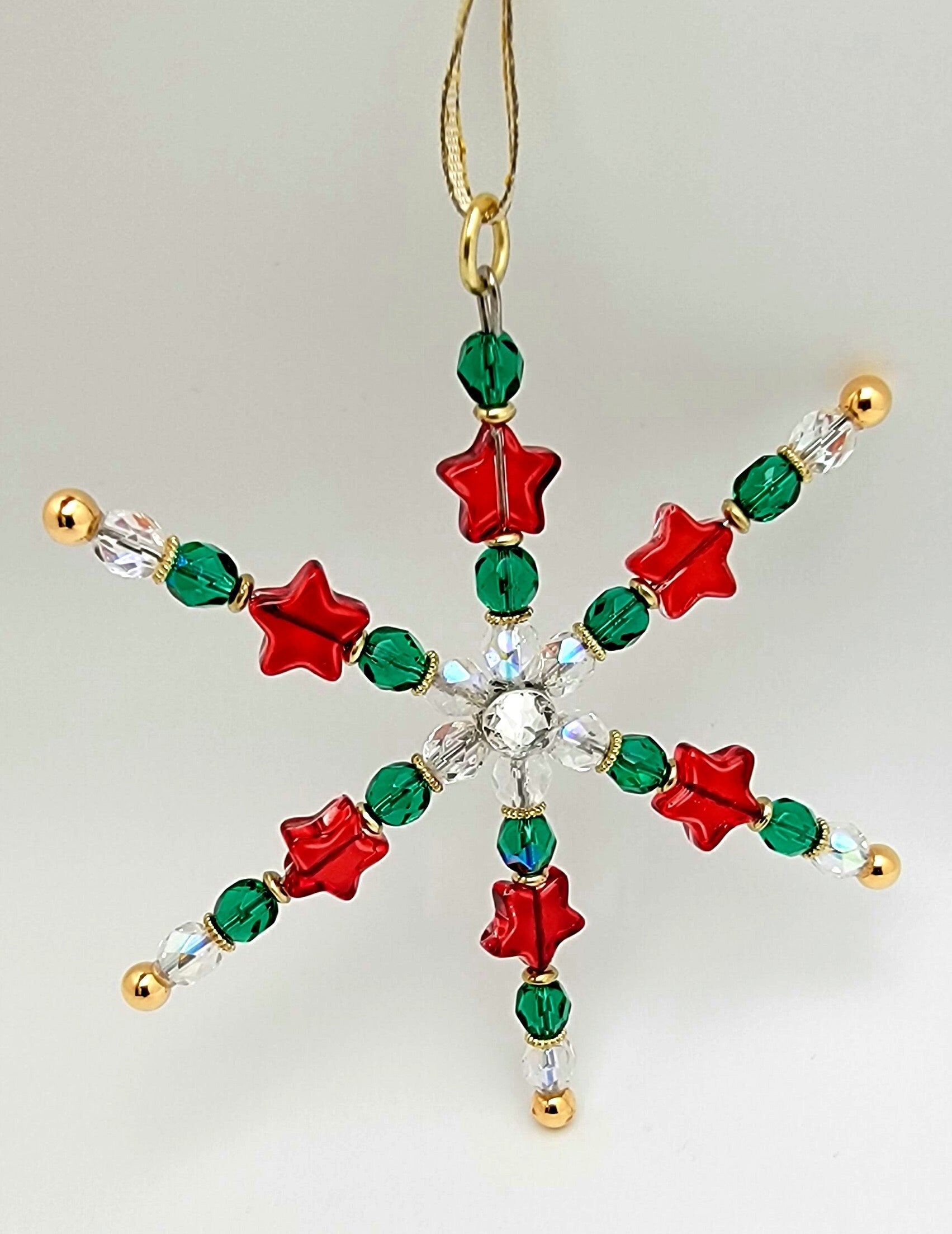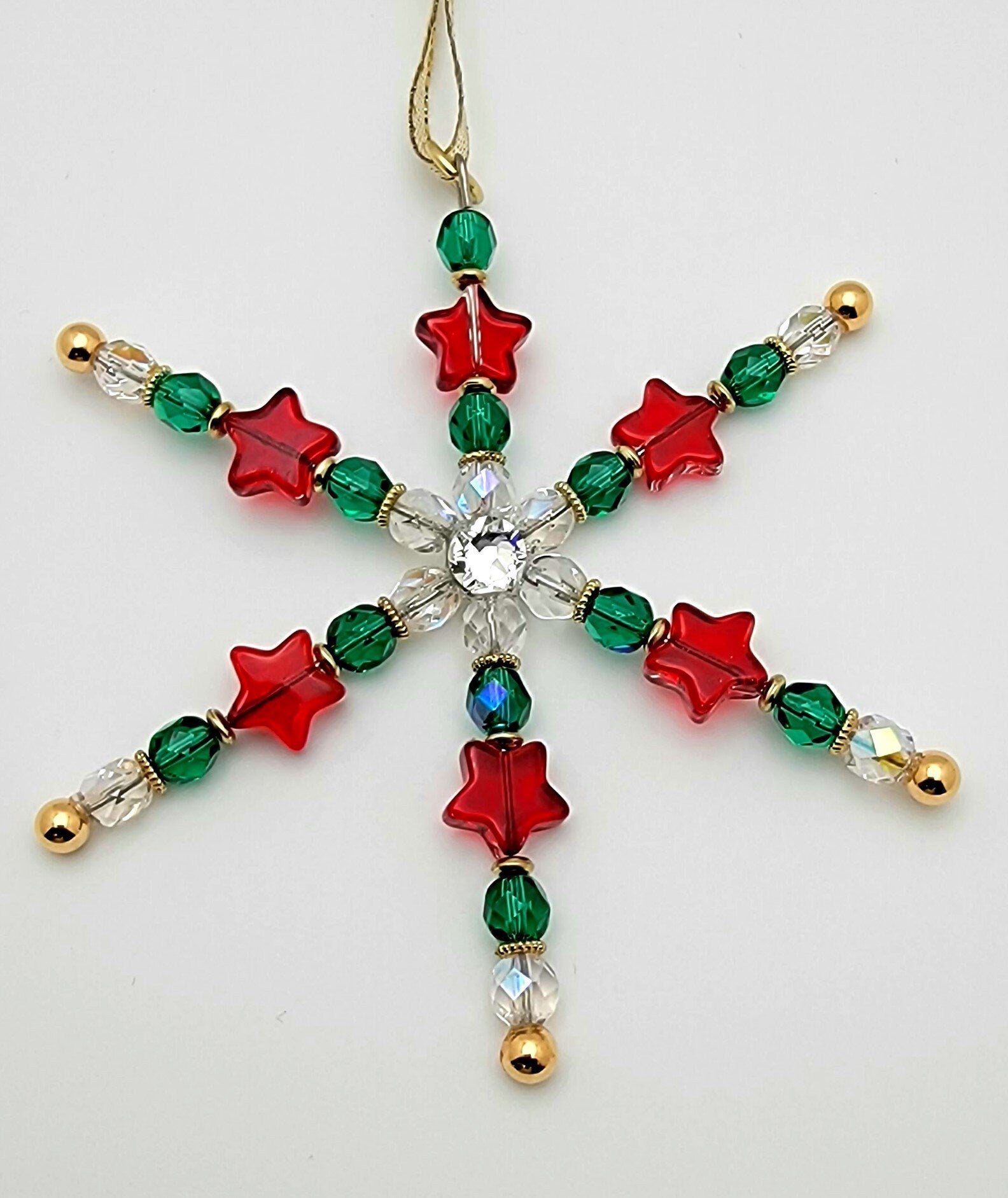 Experience the beauty of Christmas with this stunning ornament featuring vibrant red stars contrasted by elegant green and clear glass crystals and touches of gold. This 4" treasure also doubles as a mesmerizing suncatcher, making it a versatile addition to any holiday display. And don't forget the dazzling Swarovski crystal center, adding a touch of luxury to this already magnificent piece. Don't miss out on this must-have for the holiday season!