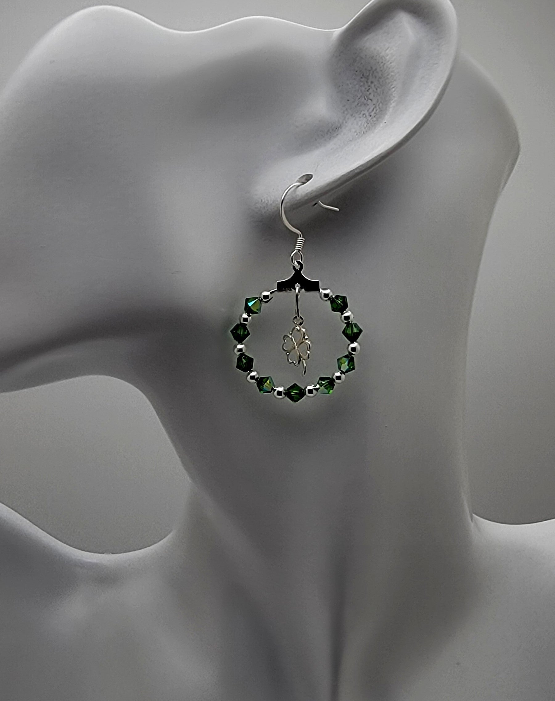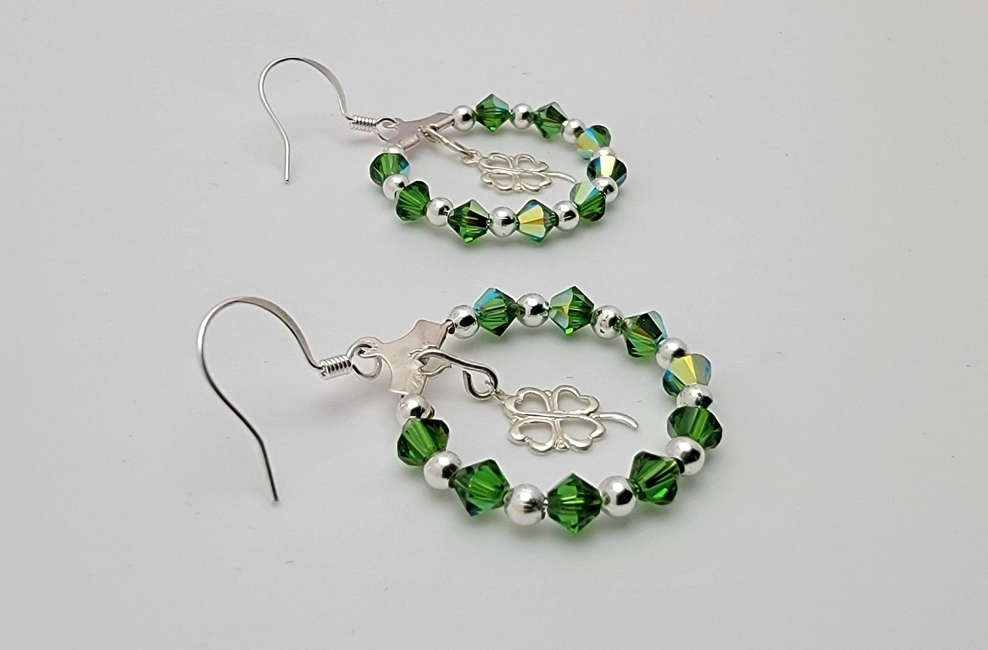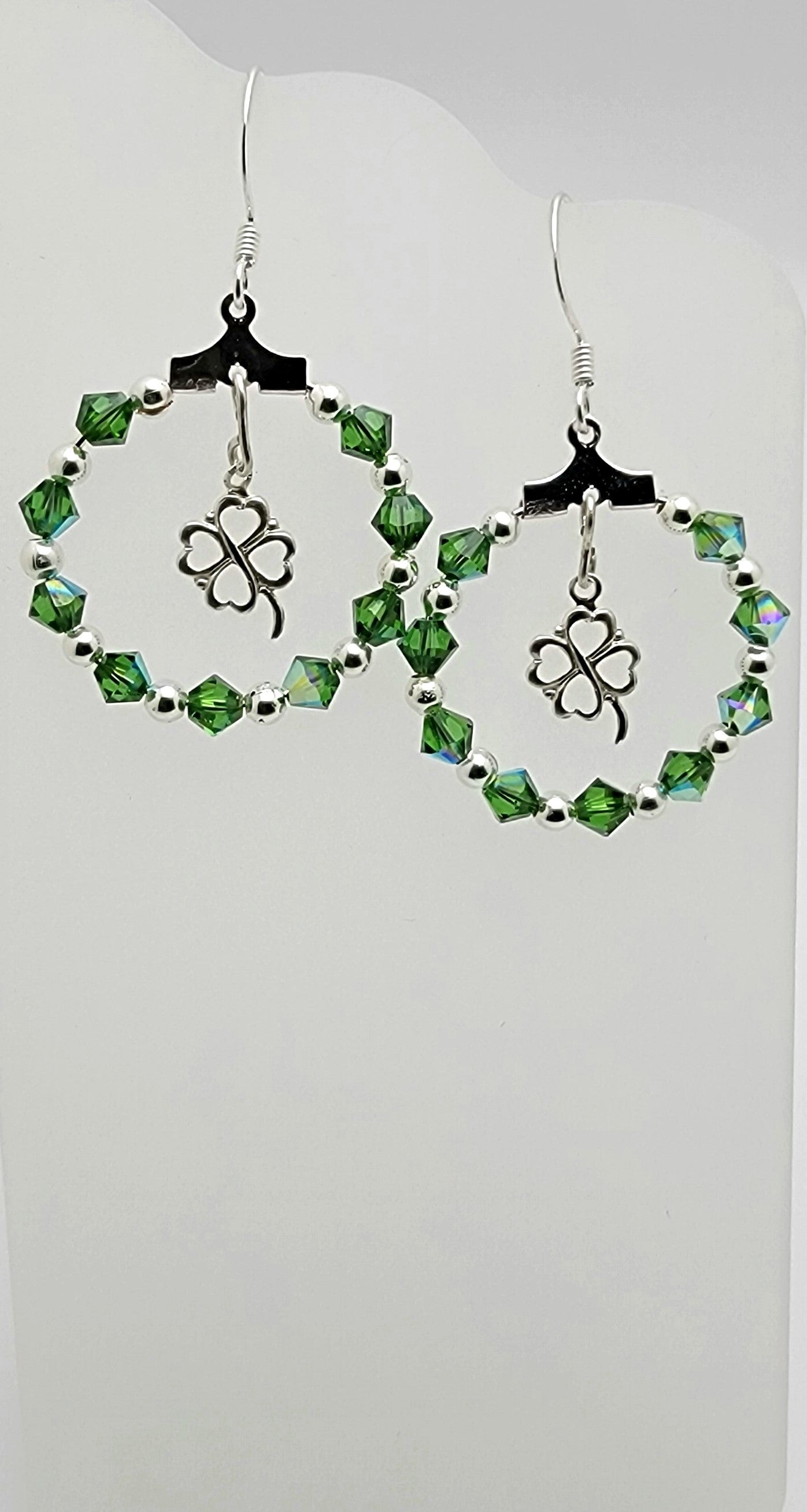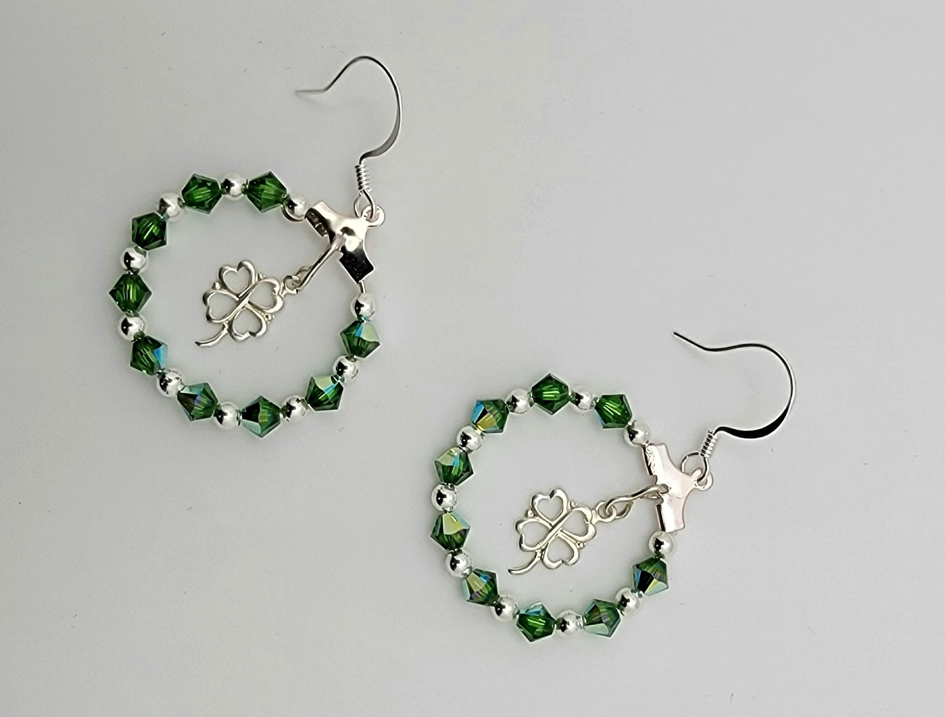 Silver 4 Leaf Clover and Fern Green Crystal Passion Hoops