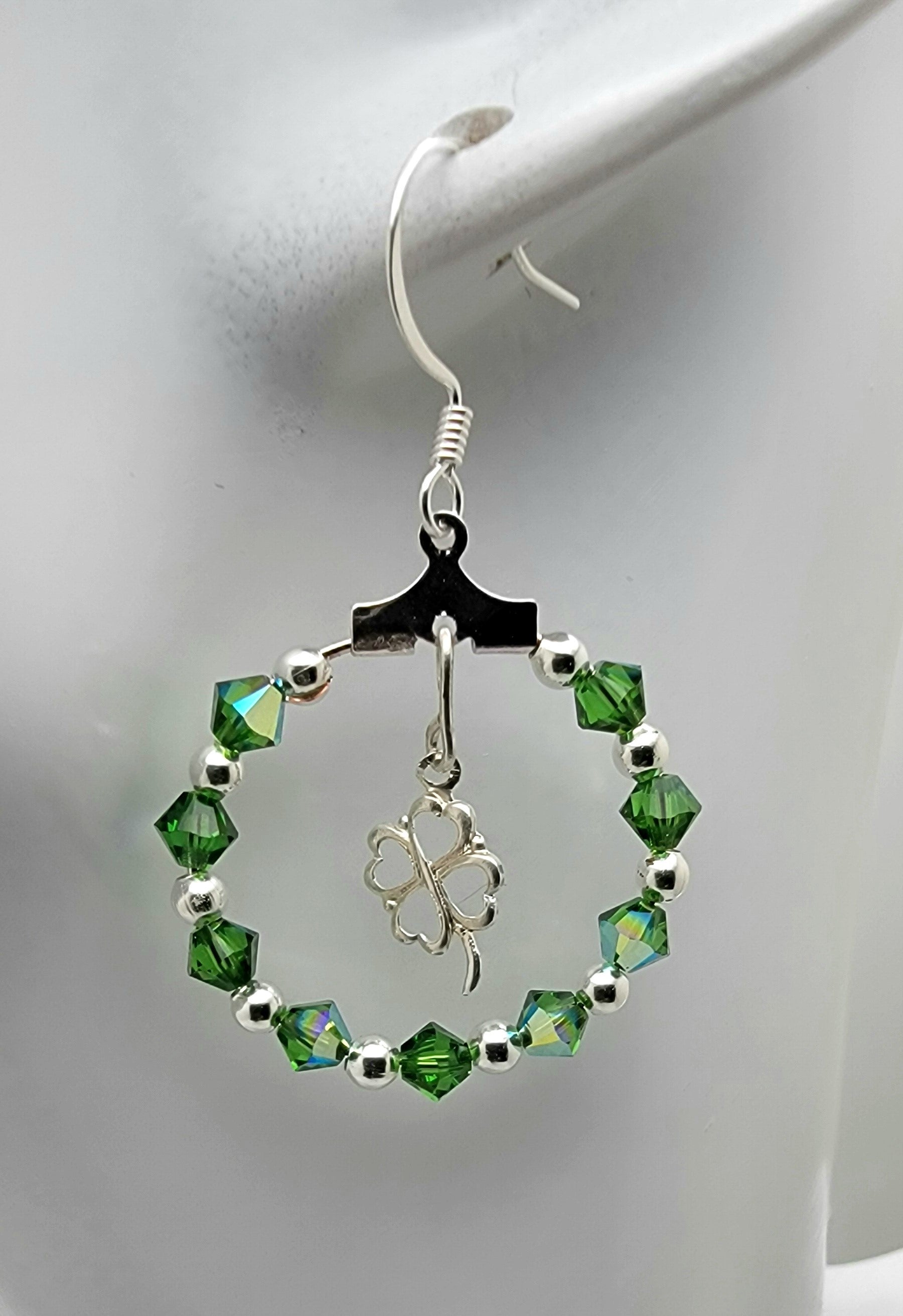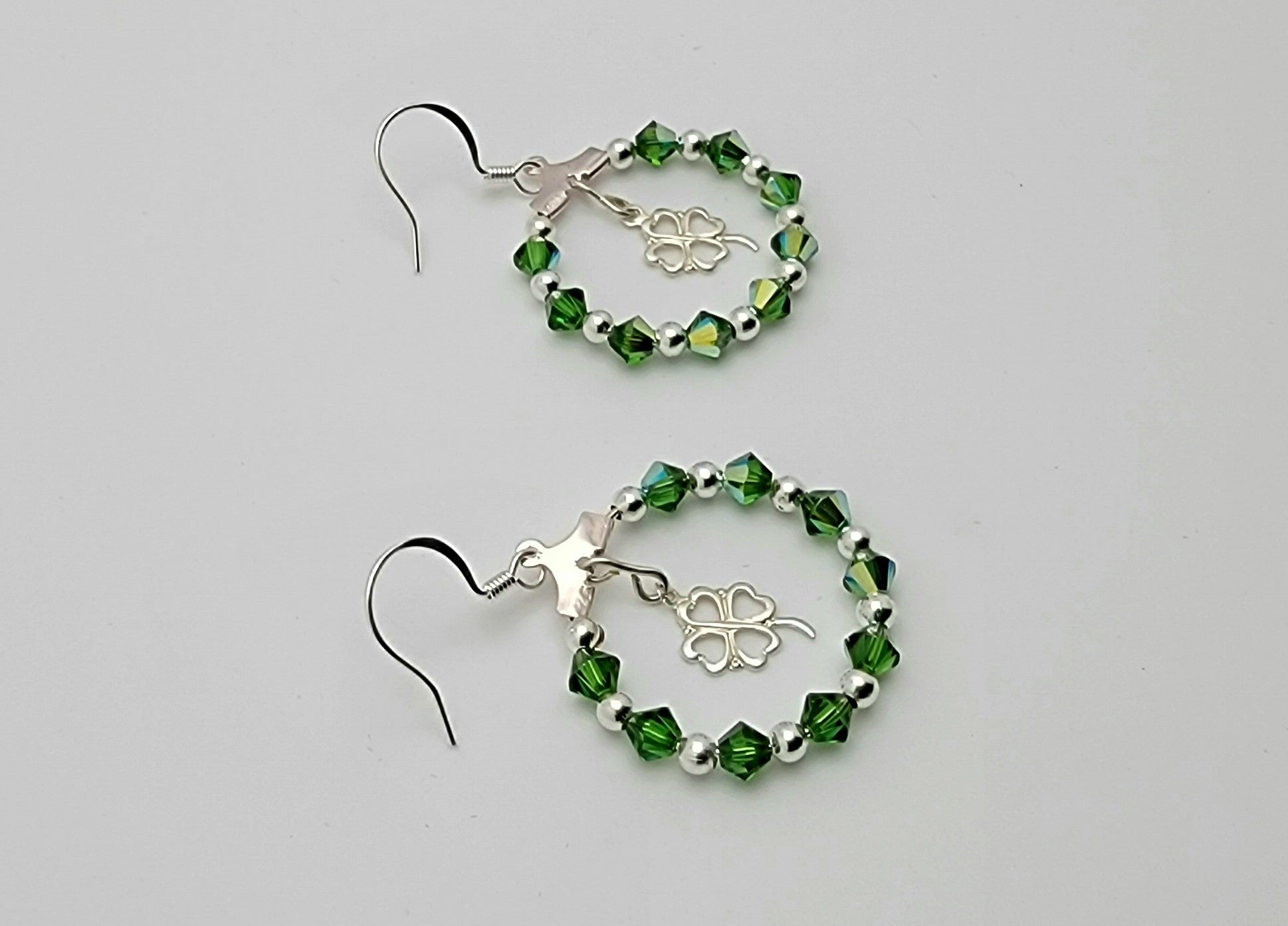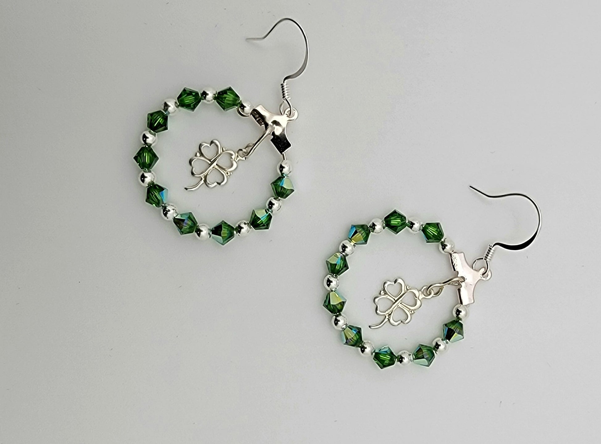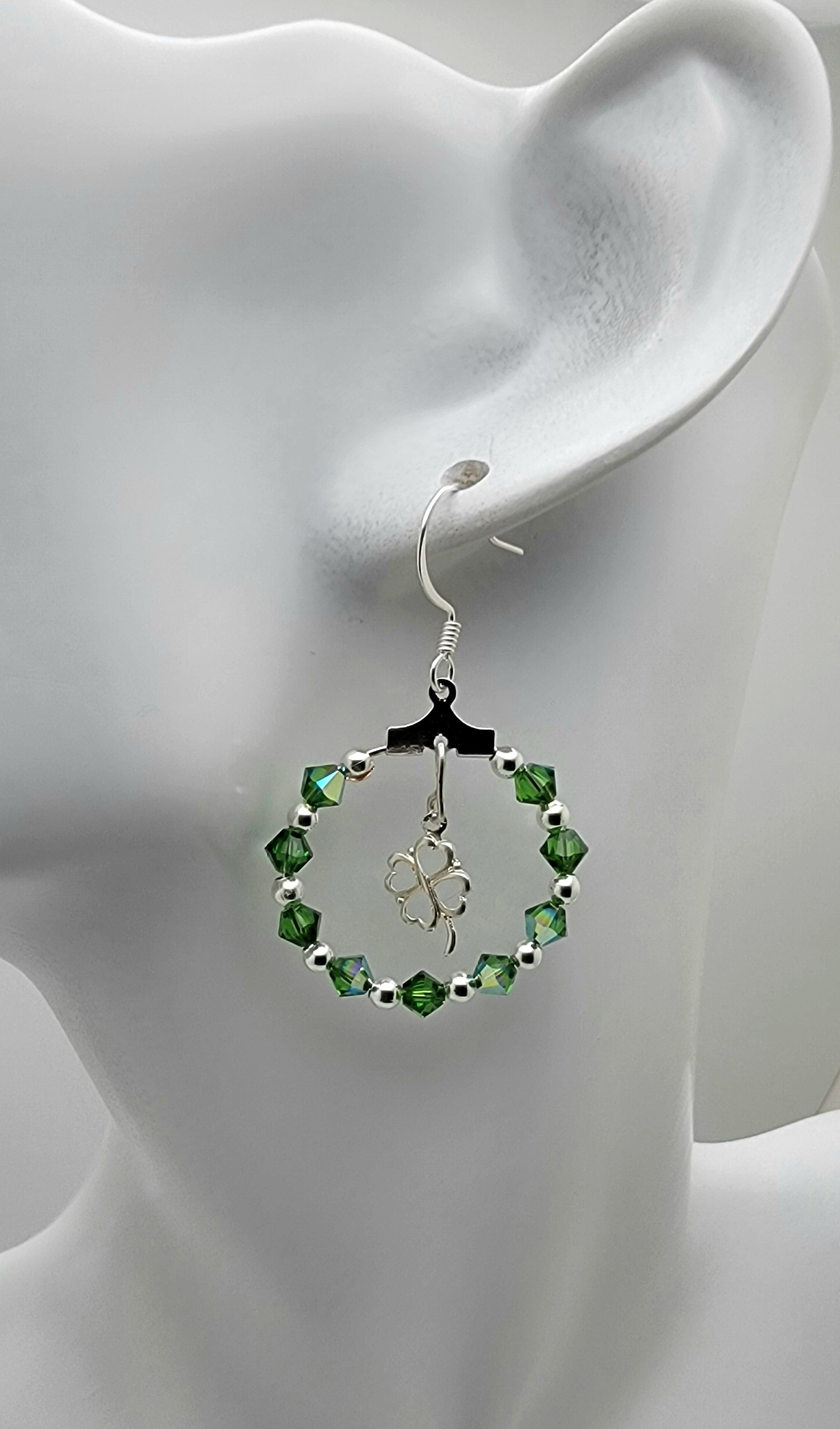 Silver 4 Leaf Clover and Fern Green Crystal Passion Hoops
