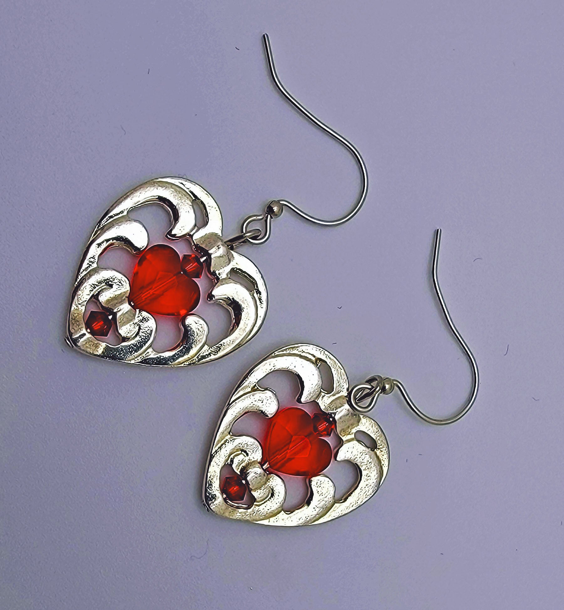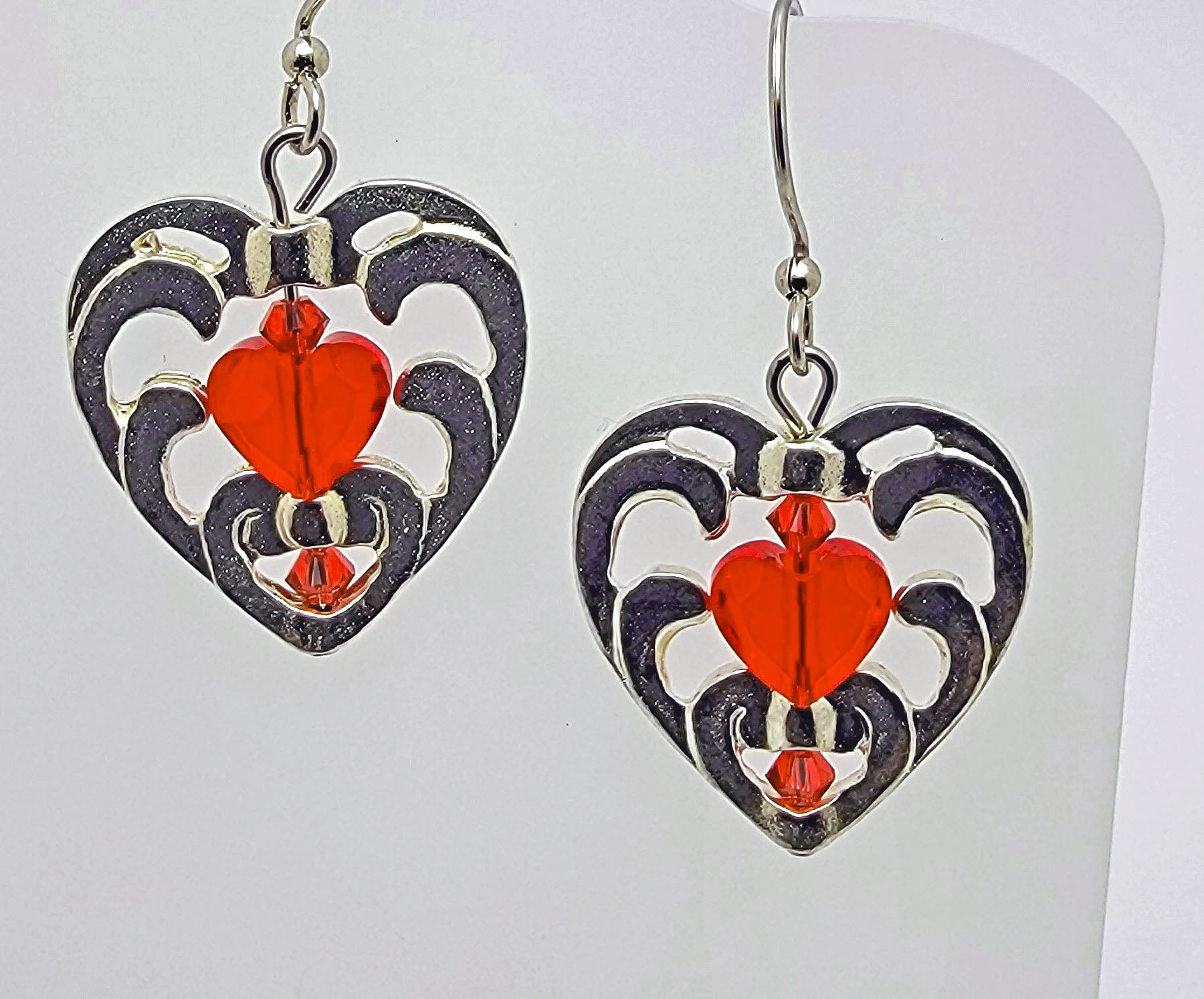 Give her a symbol of your love with these stunning earrings featuring a Crystal Passions light Siam faceted heart nestled inside a silver heart frame. The translucent heart crystal will catch the light and dazzle with its radiance. The silver heart frame adds a touch of modernity to these earrings. With a 1" drop and 1.5" total length, these earrings are finished off with a silver plated fishhook ear wire.